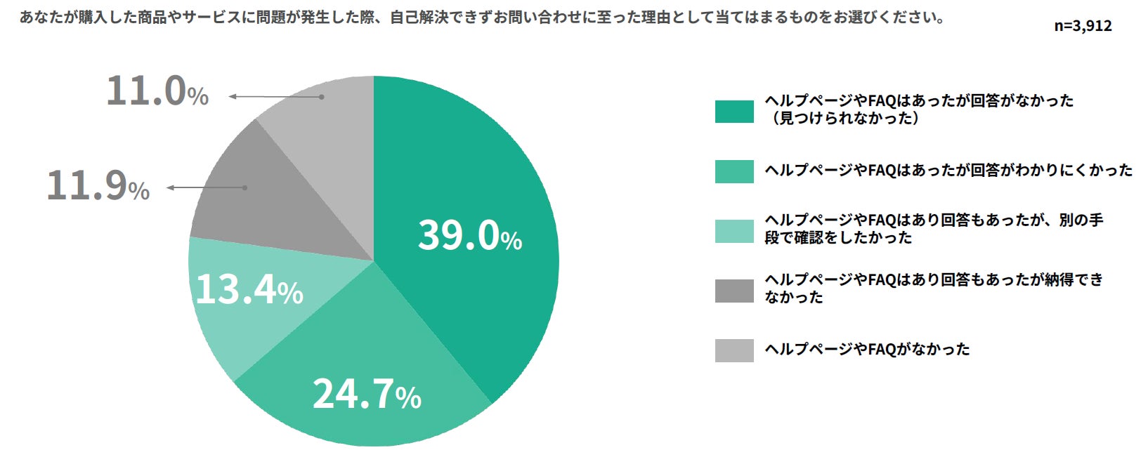 問い合わせ対応にFAQを活用することで、問い合わせ者の自己解決を導くカスタマーサポートを実現します。一方で、カスタマーサポート調査2025では、FAQやヘルプページをみつけたものの問題の解決となる情報にたどり着かず、問い合わせにいたる方が77.1%存在することがわかっています。問い合わせ窓口の対応時間を問わないFAQで問題解決をすることができれば、問い合わせ者はその場で自己解決でき、その分カスタマーサポート部門は複雑な問い合わせの対応に専念することができるため、企業の生産性向上に繋がると考えています。