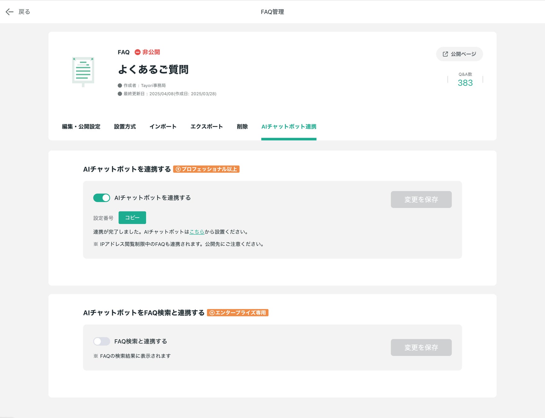 2.同じ画面にある「AIチャットボットをFAQ検索と連携する」をONにします。