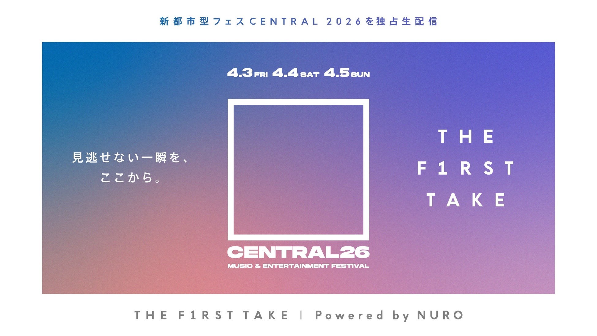 今年は新たに、日本が誇るYouTubeチャンネルとして国内外から高い注目を集めている「THE FIRST TAKE」にも協賛。「CENTRAL MUSIC & ENTERTAINMENT FESTIVAL 2026 / THE FIRST TAKE Powered by NURO」と題して、「CENTRAL」の様子を全世界同時に独占生配信します。