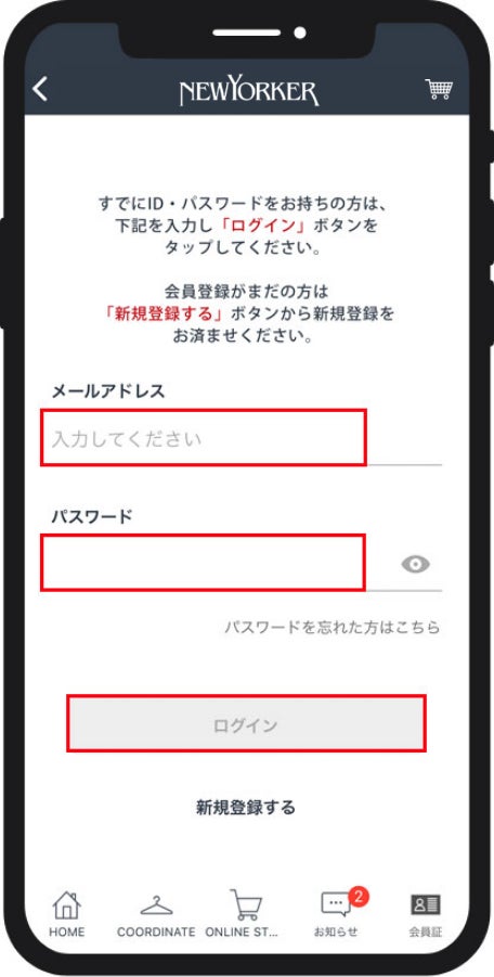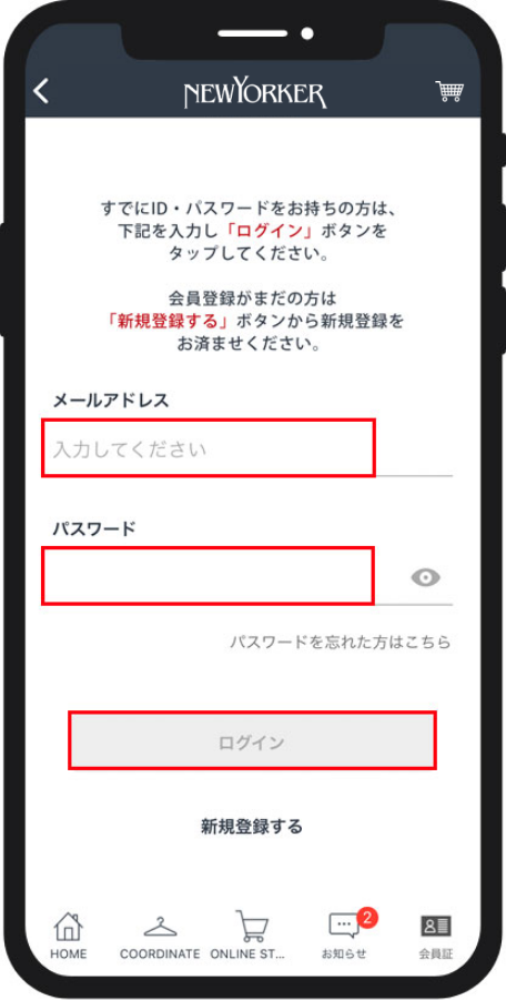 NYオンラインに登録されているメールアドレス・パスワードを入力し、「ログイン」をタップしてください。