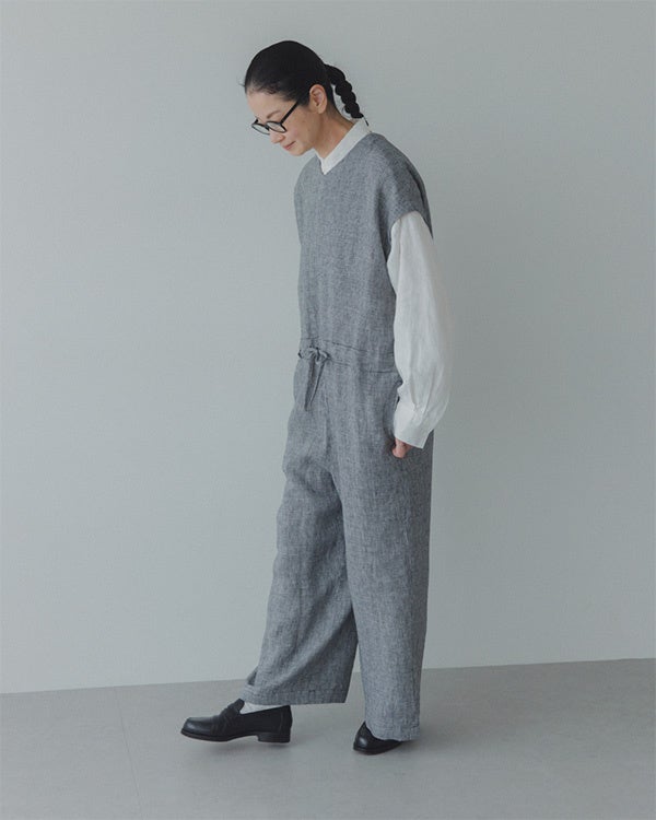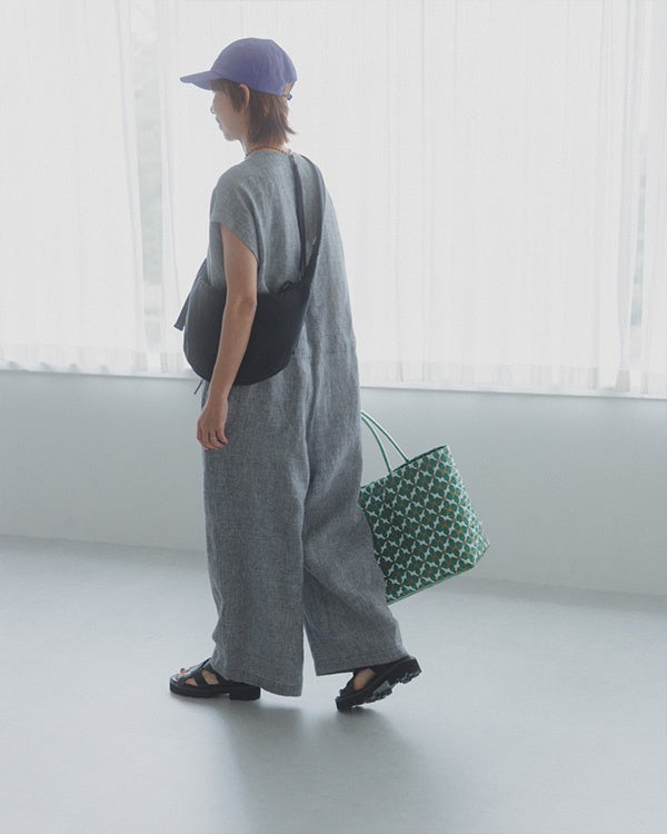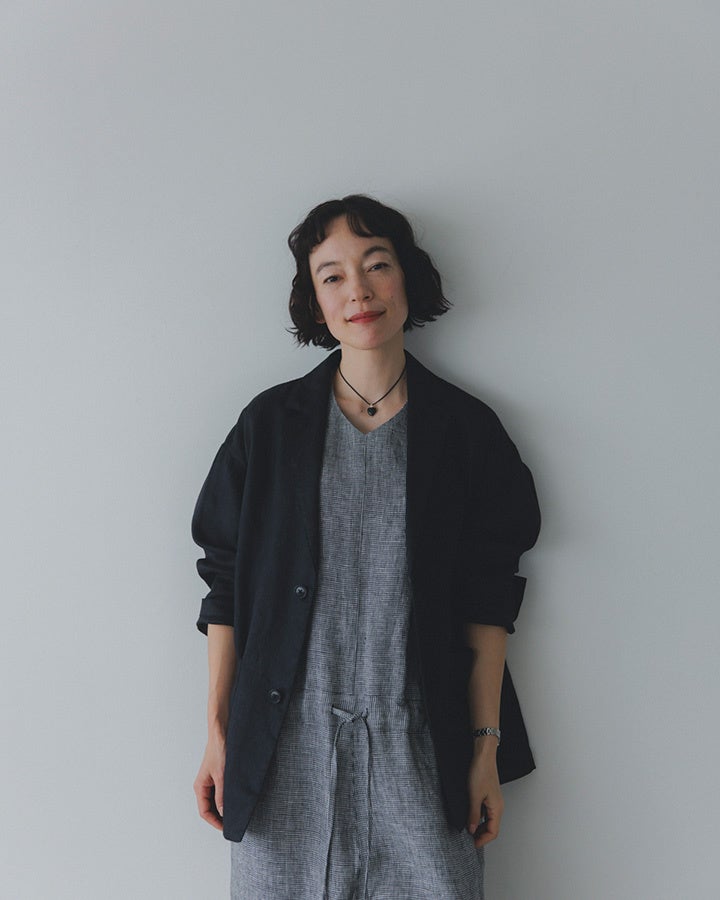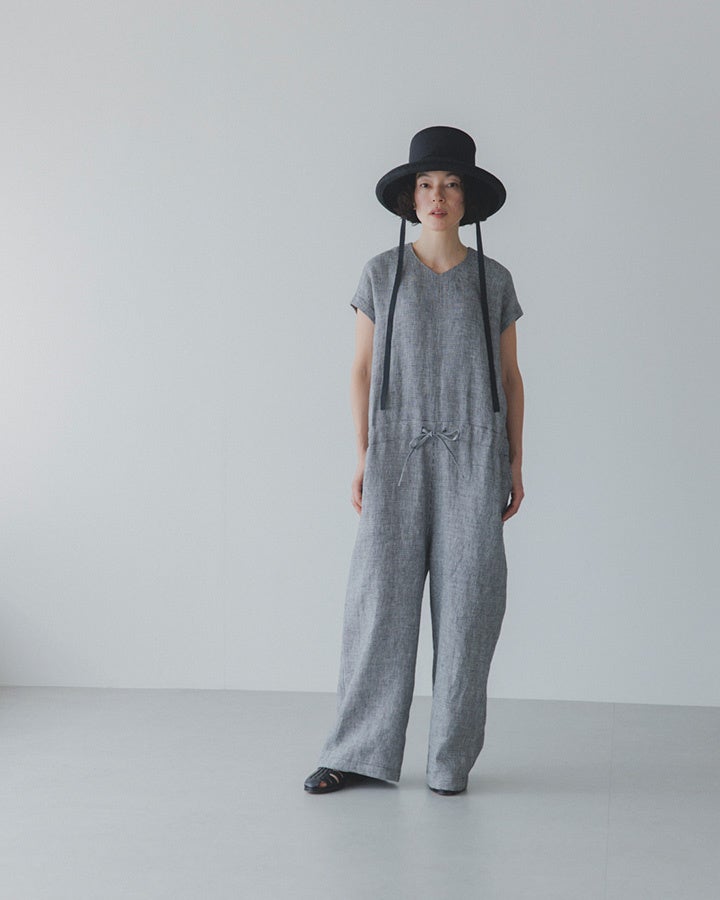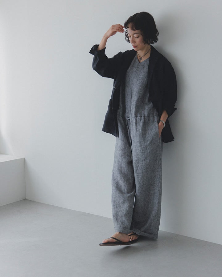佐藤さん「ご好評いただいた第一弾コラボアイテムのリネンジャケットにも合うような新たなアイテムを、かぐれさんとまた一緒に作りたかったので、今回このようにお届けできて嬉しいです。実は打ち合わせで、かぐれさんの店舗で新作を見せてもらった際に、オールインワンに一目惚れして購入し、実際とても使い勝手がよくて、昨年の夏はたくさん着回したんです。 そのオールインワンをヒントに、今回の第二弾コラボアイテム・千鳥柄のリネンオールインワンが生まれました」