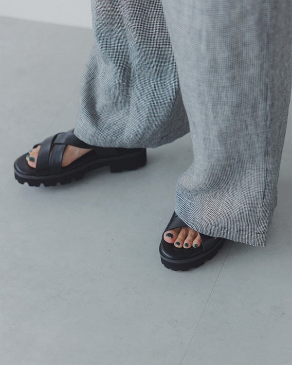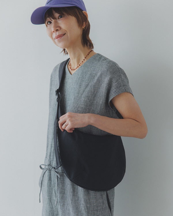 佐藤さん 「休みの日に、さらっと近所にお買い物へいくイメージで着てみました。ショルダーバッグをかけて、キャップと足元は黒のレザーサンダルを。 スポーティーな小物と合わせると、また雰囲気がガラッと変わりますよね」