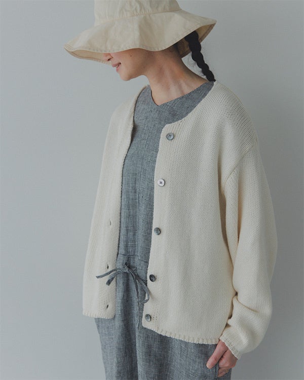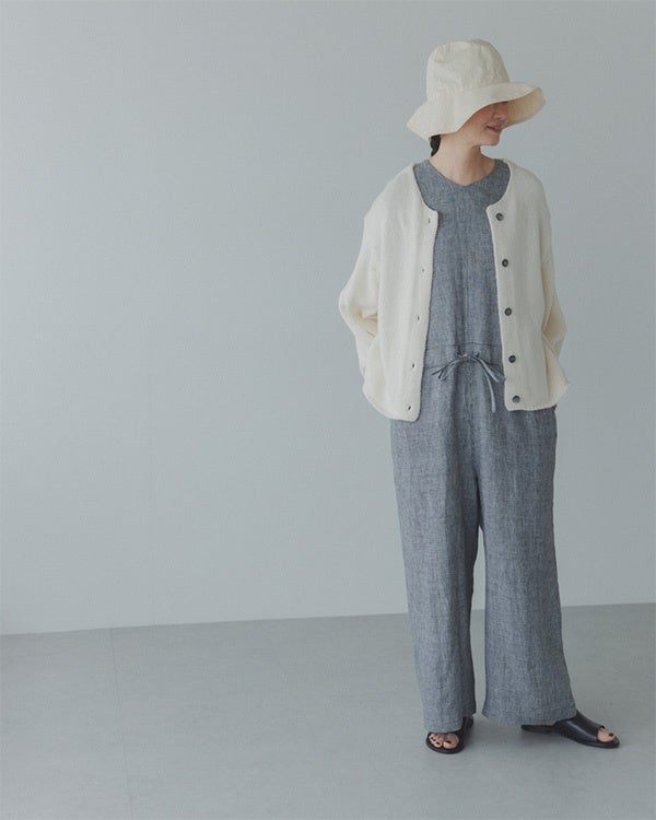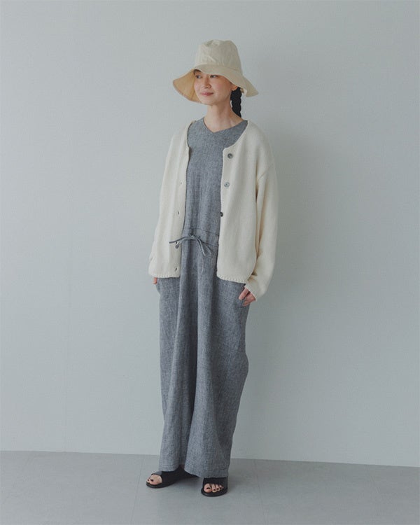 まずはこのコラボ企画にも開発から携わっている、奥田MDのコーデ。コラボアイテムの「千鳥柄のリネンオールインワン」に、アイボリーのカーディガン(かぐれ / コットンローゲージショートカーディガン)*とハット(私物)と合わせたコーディネートを。