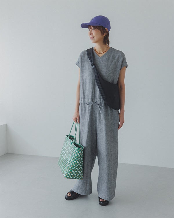 奥田 「このオールインワンは後ろのファスナーに、長めのリボンがついていて、着こなしのアクセントにもなりますし、ファスナーの上げ下げがしやすく脱ぎ着のストレスも軽減されています。 リネン100%のほどよい厚みの生地で、透け感も気にならず、さらにニュアンスのある千鳥柄なのでシワも気になりにくいのがいいなと思います」