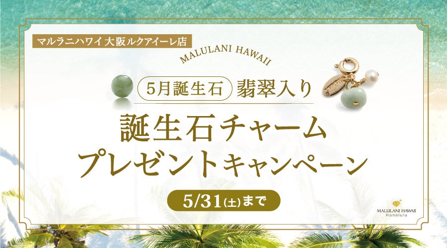 ハワイ発祥の天然石アクセサリーブランド「マルラニハワイ」ルクアイーレ店では、5月にお誕生日を迎えられる方で税込11,000円以上ご購入いただいたお客様へ、誕生石を使用した特別なノベルティチャームのプレゼントキャンペーンを実施いたします。