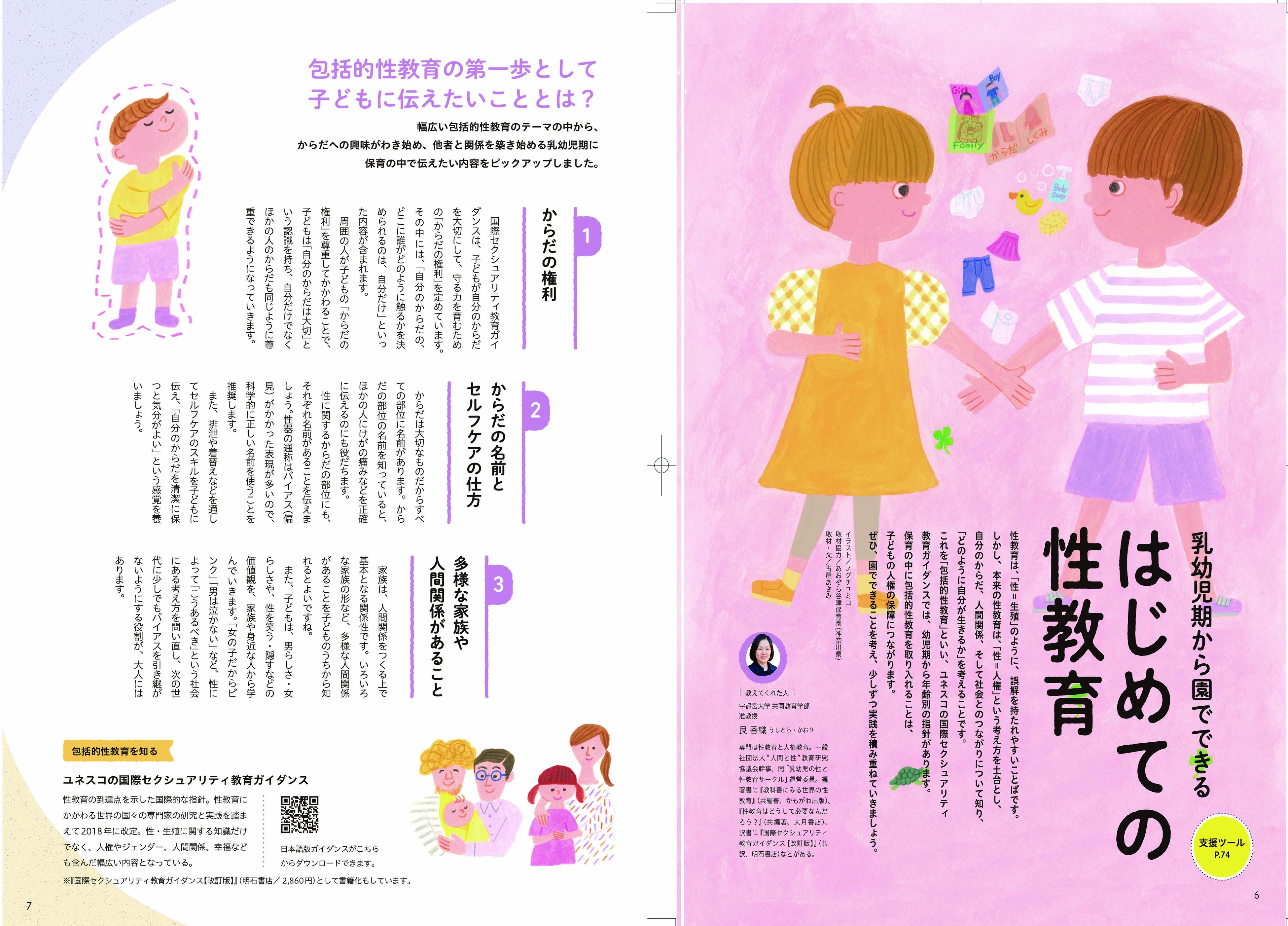 保育現場でもどのように伝えればいいのか?と迷いの多い、「性教育」を特集します。体について理解を深め、自分自身を守れるように学ぶこと。そして、ジェンダーのみならず、様々な互いの違いについて尊重すること。それらを含め、幅広い視点での「性教育」についてご紹介します。