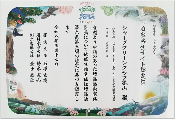 「シャープグリーンクラブ亀山ビオトープ」が「自然共生サイト」に認定