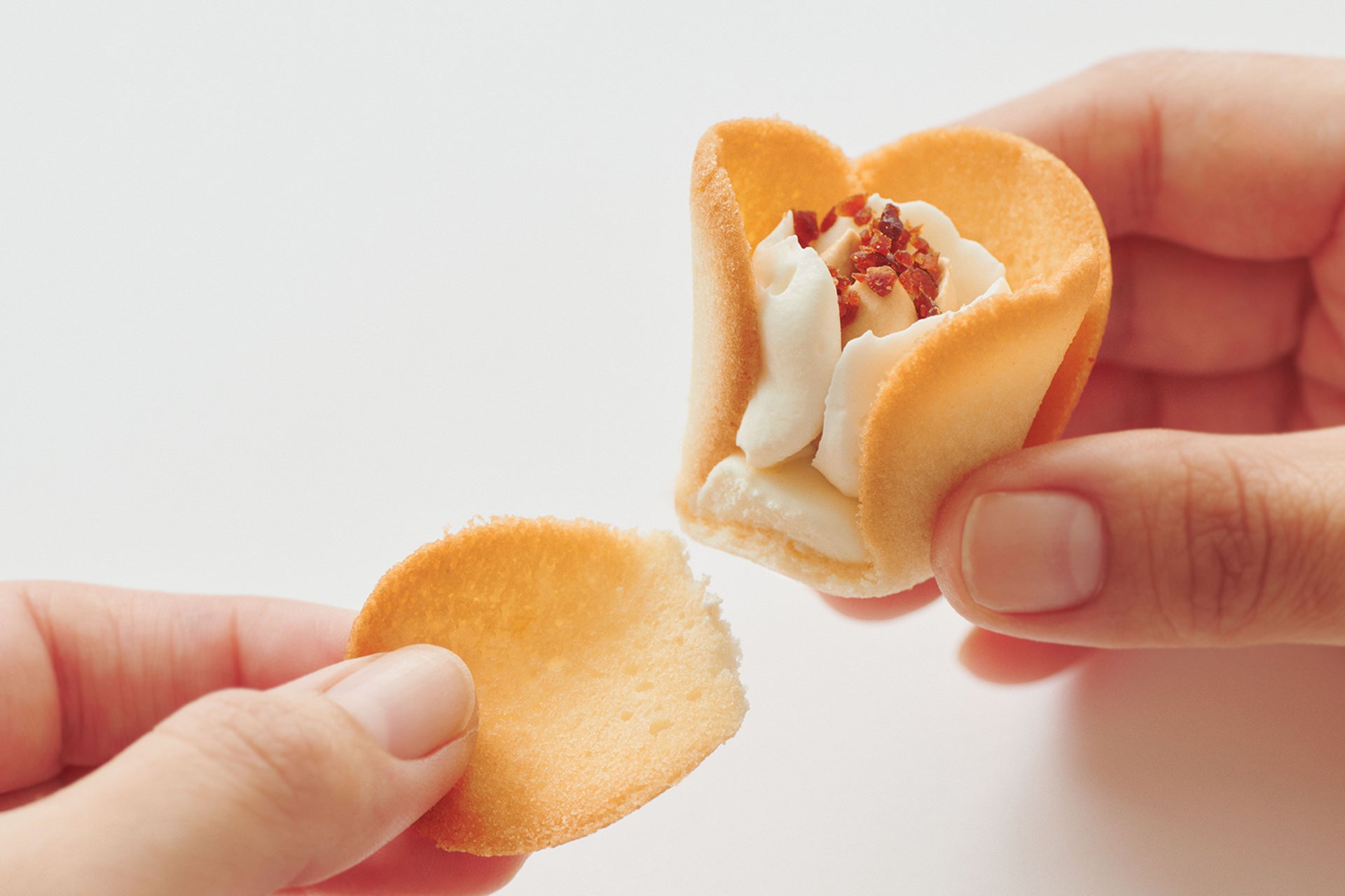 ラングドシャクッキーをわずか7秒でチューリップへと形作る独自の製法や、なめらかな口どけのままバラの形にクリームを絞る精巧な技術があって初めて可能になった、世界中で当店だけの一品です。
