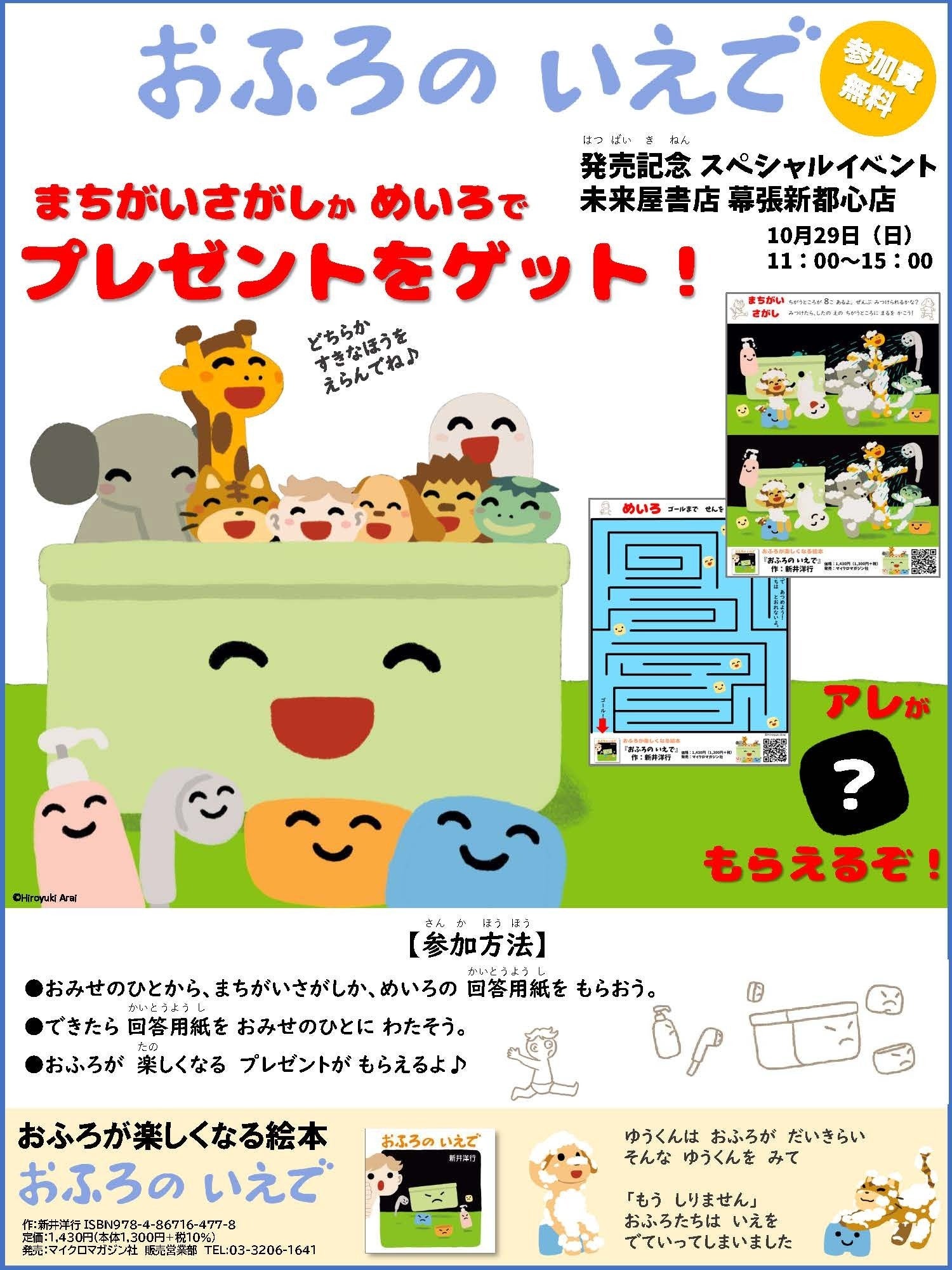 新井洋行先生の新作絵本『おふろの いえで』の発売を記念したスペシャルイベントを、10月29日(日)に未来屋書店 幕張新都心店にて開催いたします。