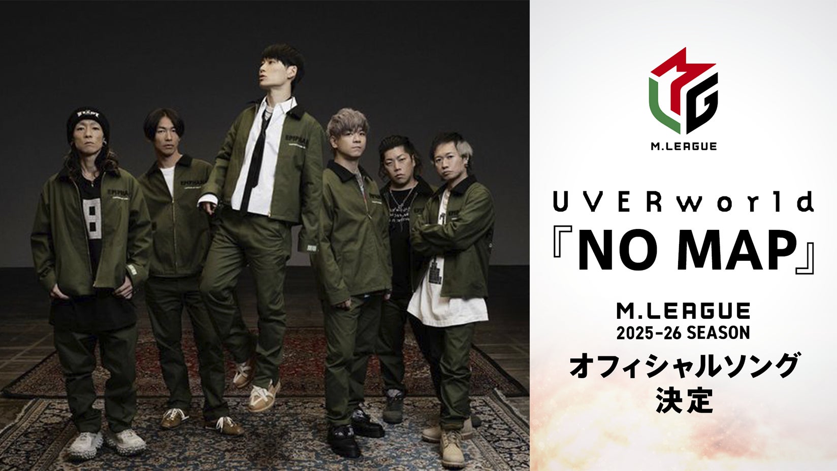 熱き戦いが予想される「Mリーグ2025-26」の開催にあたり、「ABEMA」ではUVERworldによる新曲『NO MAP』をオフィシャルソングに決定。UVERworldはこれまでに「Mリーグ2022-23」において2013年リリースの『ナノ・セカンド』がエンディングソングに、続く「Mリーグ2023-24」において『ENCORE AGAIN (feat.SHUNTO from BE:FIRST)』が、「Mリーグ2024-25」では初の書き下ろし楽曲となる『WINGS ever』がオフィシャルソングとして起用されました。今回で4シーズン目となるオフィシャルソング起用は、2025年6月14日(土)に開催されたUVERworldの東京ドームライブ「UVERworld LIVE “EPIPHANY” at TOKYO DOME」にて初解禁。来る、「Mリーグ2025-26」を盛り上げます。