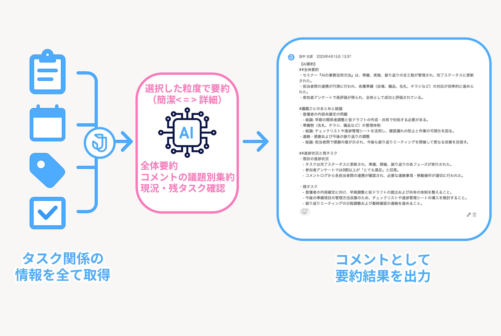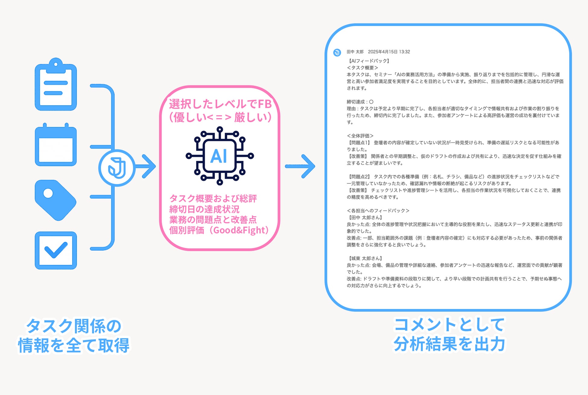 Jootoで管理されるタスクには、日々の業務に紐づく進捗・会話・成果の記録が積み重ねられ、個人やチームの資産であると私たちは捉えています。これをAIが分析して次の仕事をより良くするためのヒントを提供するのが、「AIタスク診断機能」です。本機能には、「AIタスク要約機能」と「AIタスクフィードバック機能」の2つがあり、診断したいタスクに関連する全ての情報を元にAIが分析を行います。