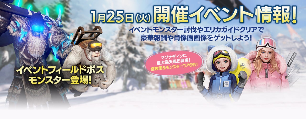 また、連動するエリカガイドミッションのクリアやフィールドボス討伐の報酬として獲得できる「雪山スキー場チケット」を利用できるイベントショップが期間限定で登場いたします。獲得したチケットは、「高級紋様強化スクロール」などのマント育成素材や、高級採取道具などの工匠素材と交換が可能です。