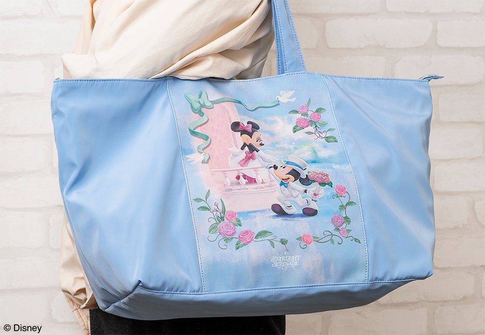 お祝いのために描きおこされた記念アート「スターライトセレナーデ」の舞台は、ロマンティックな星降る夜。永遠の恋人「ミッキーマウス」から「ミニーマウス」へ捧げる甘いメロディが聞こえてきそうな、幻想的な世界に心惹かれるトラベルバッグが登場です。
