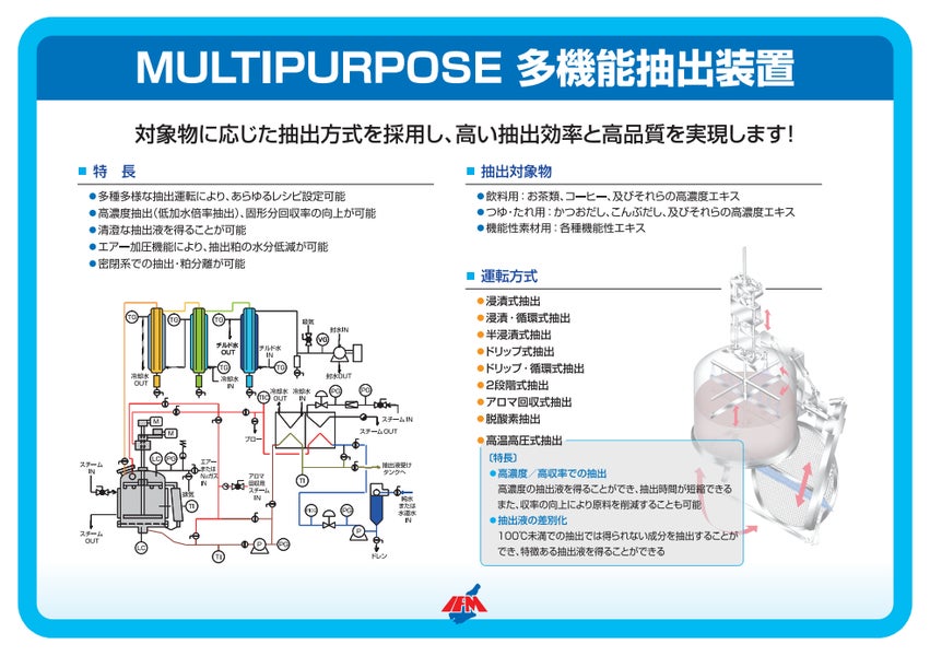 ドリップ抽出、浸漬抽出、半浸漬抽出等、多種多様な抽出が1台で対応できます。 お茶・コーヒーだけでなく、だし・エキスといった調味料分野へも幅広い実績が御座います。