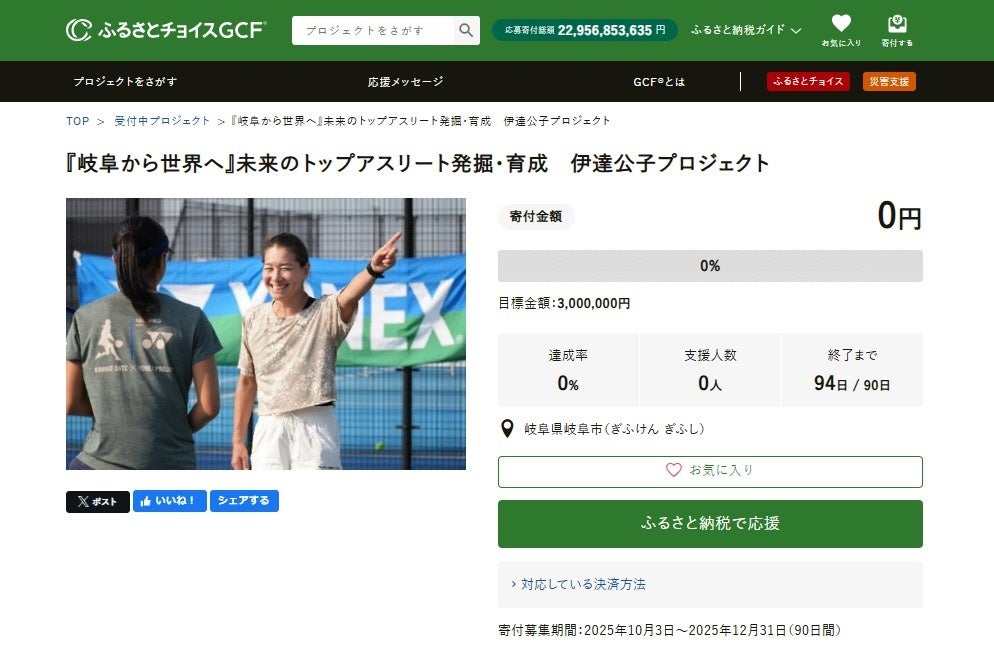 国内最大級のふるさと納税総合サイト「ふるさとチョイス」( https://www.furusato-tax.jp/ )を企画・運営する、株式会社トラストバンク(本社:東京都品川区、代表取締役社長兼CEO:大井 潤、以下「トラストバンク」)は、本日10月3日、トラストバンクが提供するふるさと納税制度を通じてクラウドファンディング型で寄付を募る仕組み「ガバメントクラウドファンディング®」(以下「GCF®」)で、岐阜県岐阜市の「岐阜国際ジュニアテニストーナメント2026」開催支援プロジェクトを開始します。募集期間は2025年10月3日~12月31日で、目標寄付金額は300万円です。集まった寄付金は、2026年11月に開催予定の本大会の運営費用に活用します。