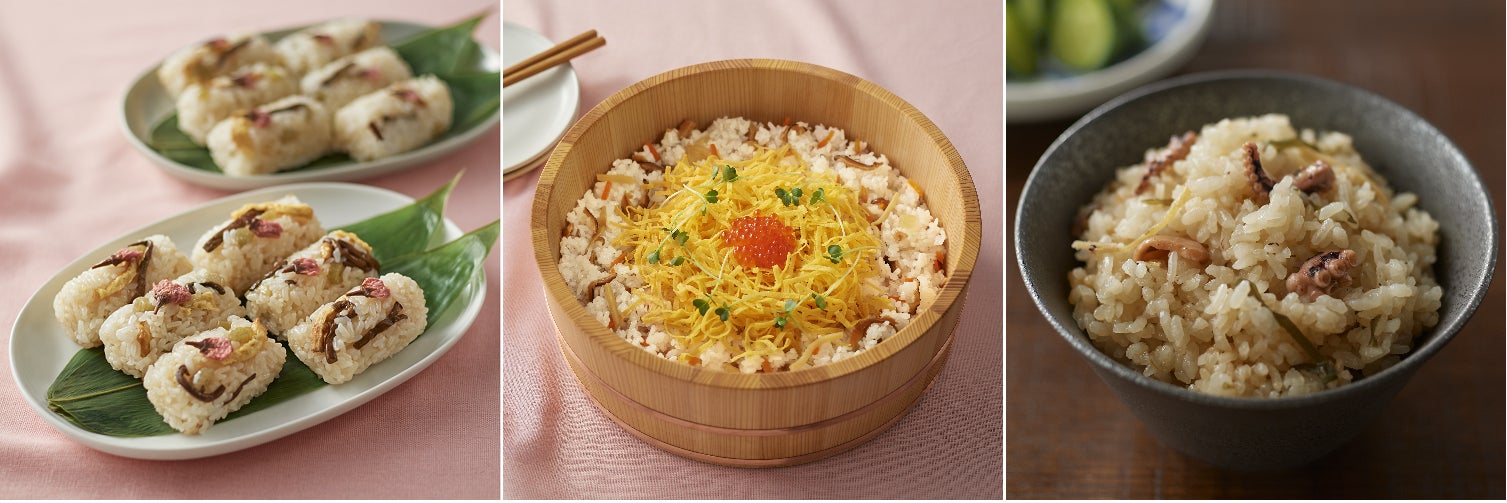 桜の花をトッピングして仕上げる、春を楽しむことができるおこわです。桜の葉エキスをきかせただしで炊き上げることで、うまみと桜の風味が感じられるおこわに仕上がります。また、おこわに適している品種の熊本県産ヒヨクモチと鹿児島県産ヒノヒカリを合わせたおこわ米と、具材には山菜と油揚げもセットにしているので、手軽に具材入りのもちもちとした食感のおこわが炊けます。