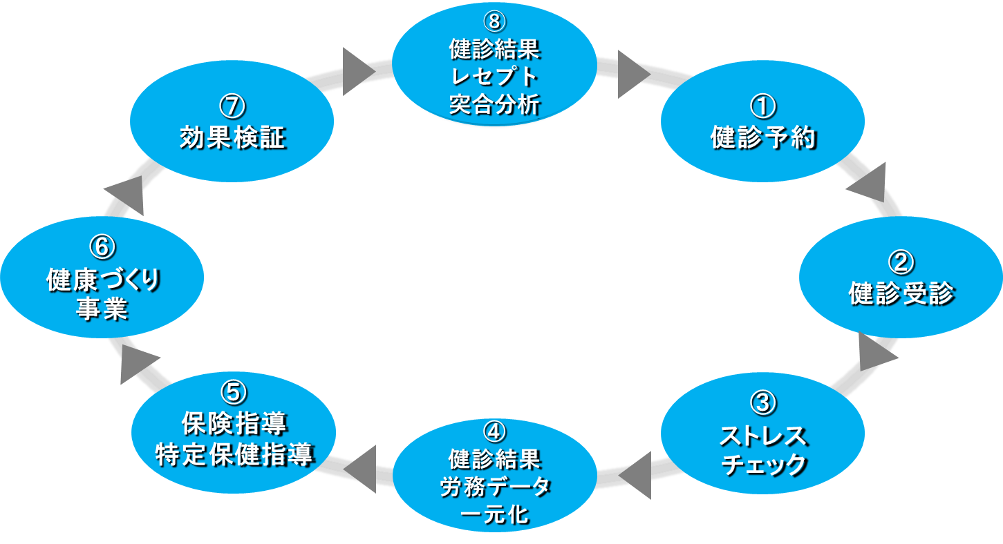 AD健保との協働により、毎年、健康診断予約からスタート。健診結果、ストレス チェック、労務データ、等をシステム上で一元化し、保健指導、特定保健指導、健康づくり事業等を実施し、効果検証を行い、レセプトとの突合分析を行います。