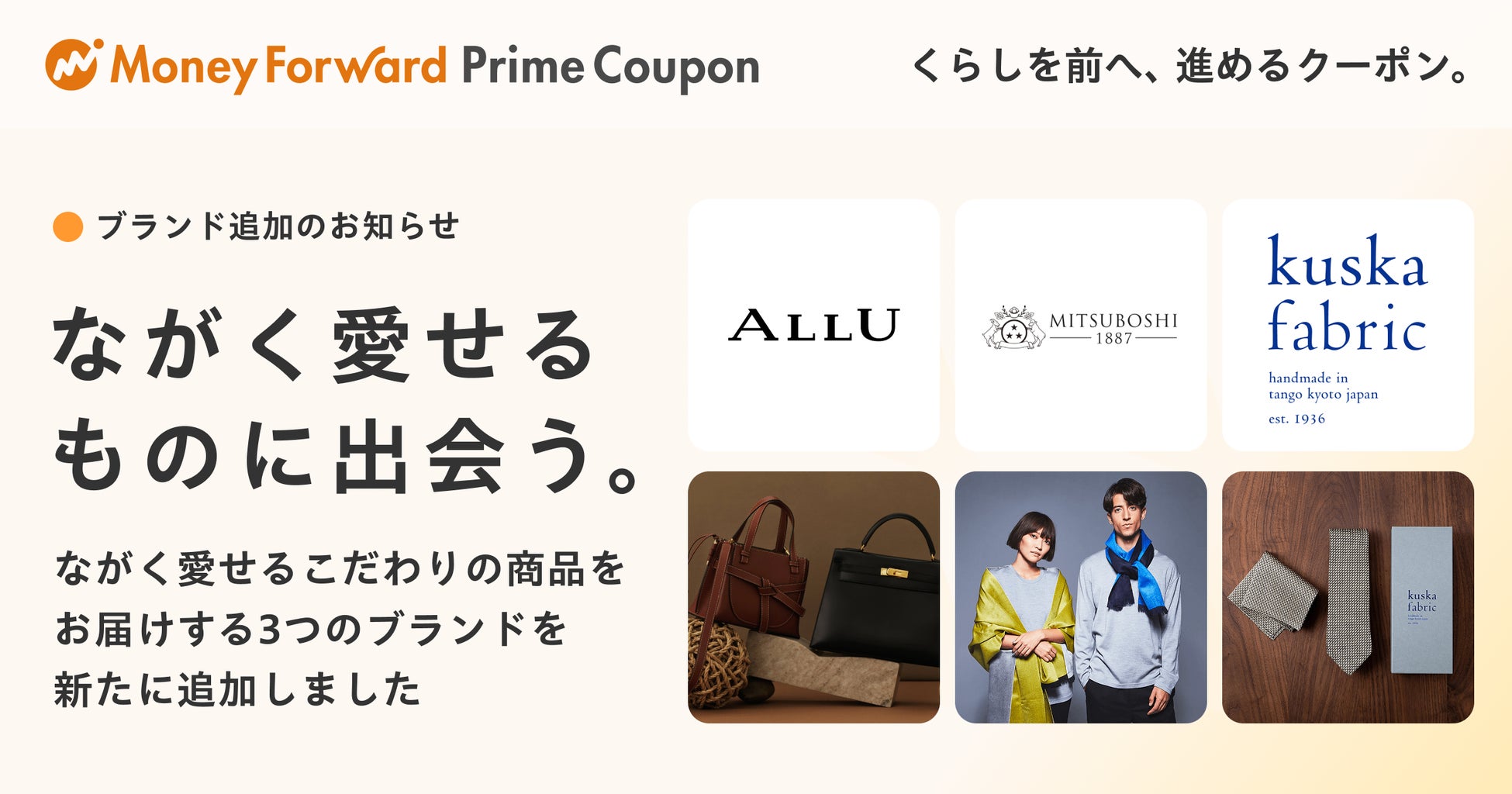 マネーフォワードホーム株式会社は、お金の見える化サービス『マネーフォワード ME』プレミアム会員限定「Prime Coupon(プライムクーポン)」の第六弾として、本日2025年11月18日(火)より新たなクーポンを提供開始します。第六弾は「ながく愛せるものに出会う」をテーマに、プレオウンド・ブランドショップ「ALLU」を展開するバリュエンスジャパン株式会社、「MITSUBOSHI 1887」を提供する老舗生地メーカー・三星毛糸株式会社、京都・丹後のオールハンドメイドブランド「kuska fabric」を提供するクスカ株式会社の3社を新たにパートナー企業として迎えました。