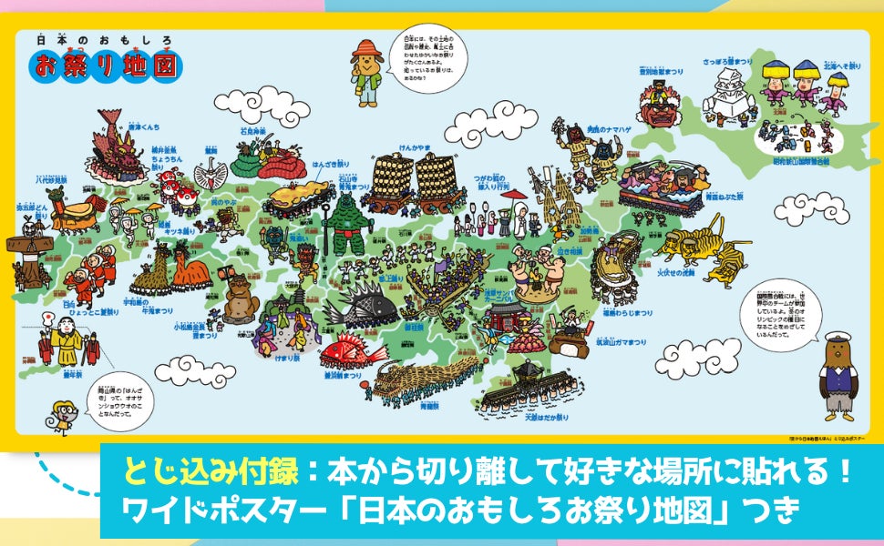 巻末には、切り離して好きな場所に貼って楽しめる、ワイドサイズのとじ込みポスターを収録。日本各地の伝統的な「お祭り」をまとめた日本地図です。「このお祭り、見てみたいね」「次は何県に旅行に行きたい?」など、親子の会話が広がるので、日本地理への関心が深まります。