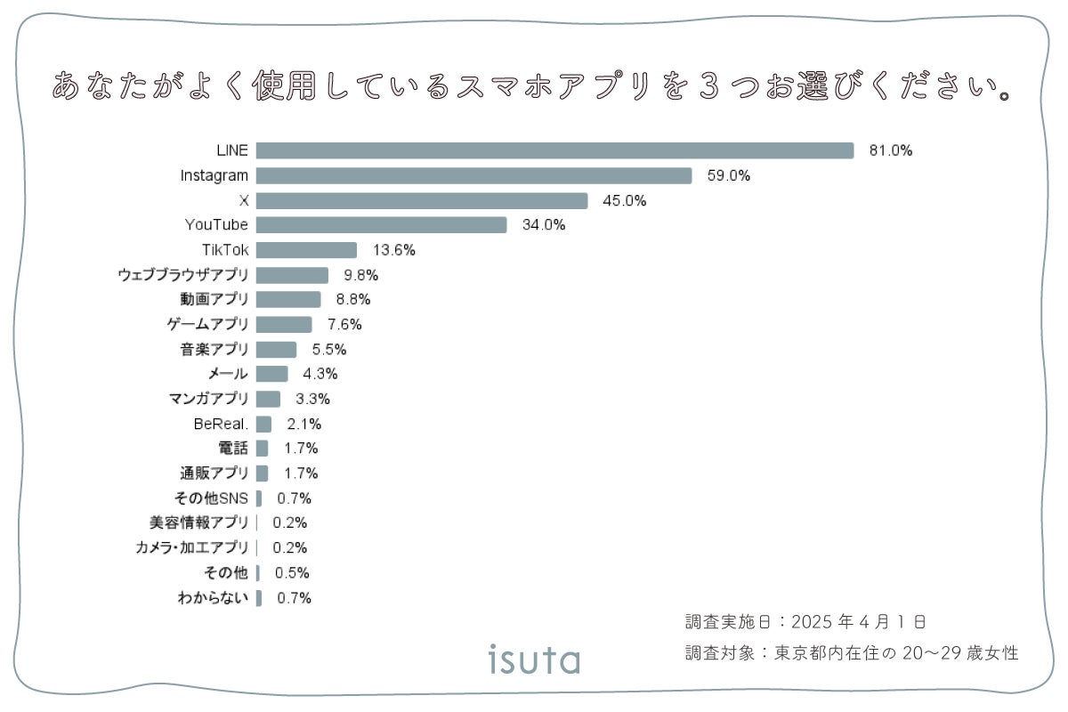 よく使用しているスマホアプリに関しては、LINE、Instagram、X、YouTubeが圧倒的に多く、ウェブブラウザを挙げた人は全体の10%にも満たないという結果でした。