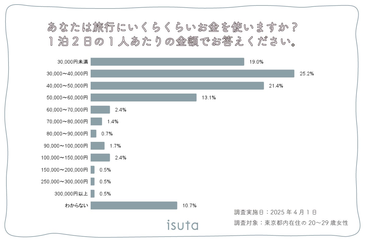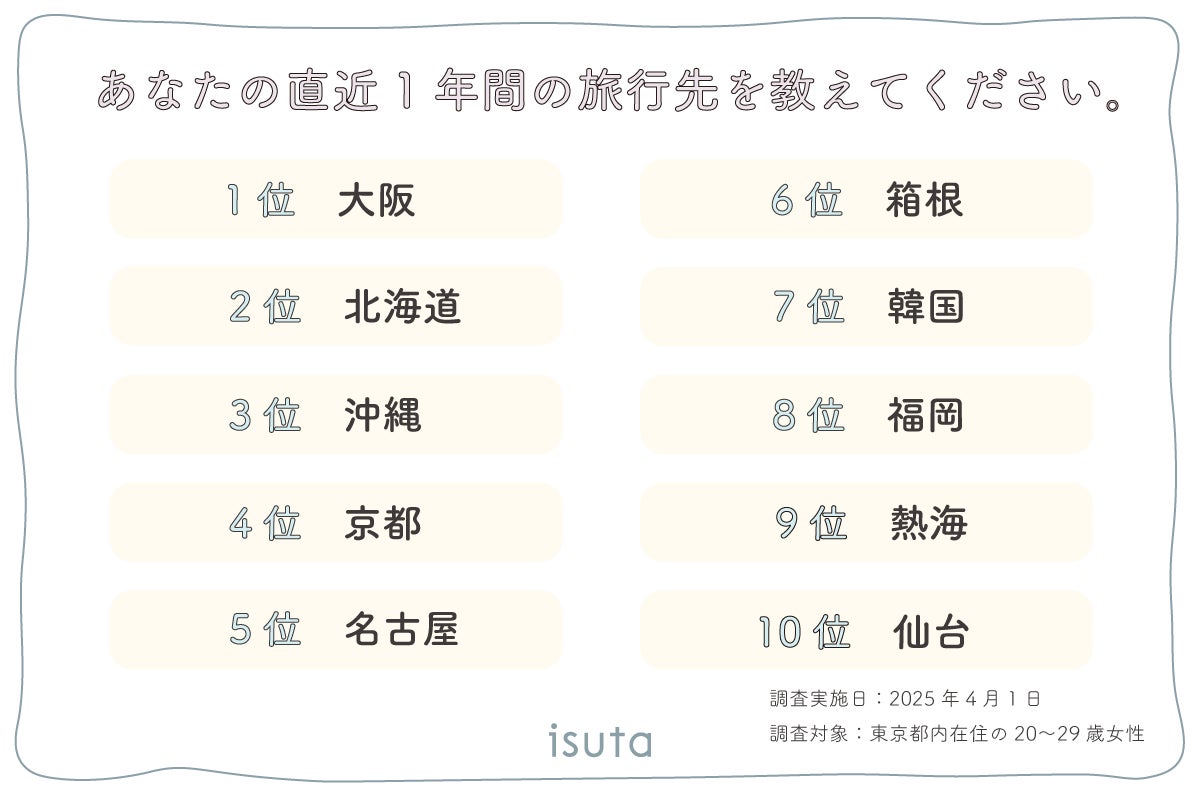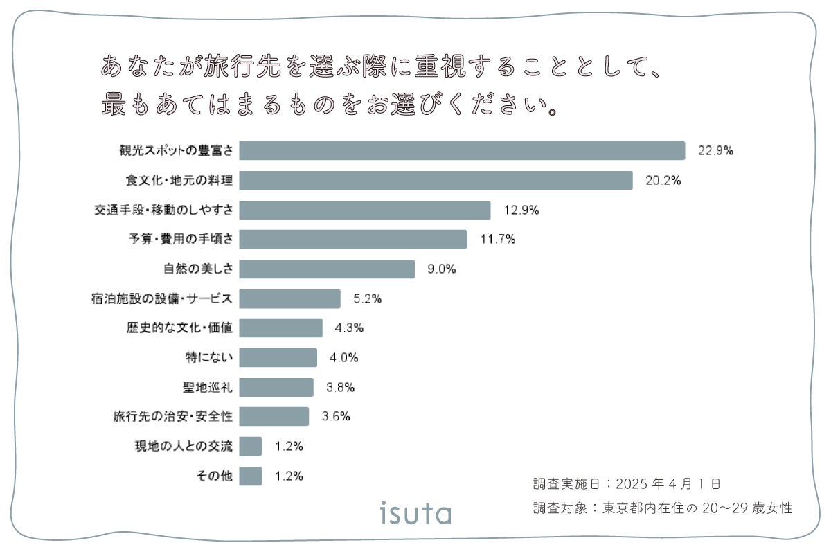 株式会社PR TIMES(本社:東京都港区、代表取締役:山口 拓己、東証プライム:3922)が企画・運営を手掛けるZ世代向けメディア「isuta(イスタ)」は、東京都内在住の20〜29歳の女性420人を対象に、旅行・お出かけに関するトレンド調査を2025年4月1日に実施いたしました。isutaでは、Z世代女性のリアルなライフスタイルを紐解き、コンテンツへの反映と企業向けのマーケティング支援に貢献することを目指し、Z世代の実態を深ぼる調査を今後も継続的におこなってまいります。