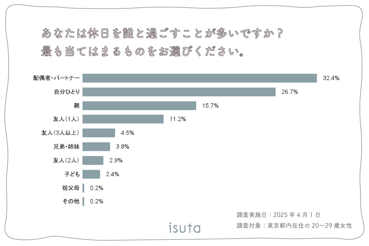 休みの日は配偶者やパートナーなどと過ごす人が多いほか、「ひとりで過ごす」と答えた人も26.7%となっており、「ひとり旅」に関する調査同様に、休日の過ごし方においても他者との予定に縛られず、自分のペースで自由に過ごすことを好む人が一定数いるようです。