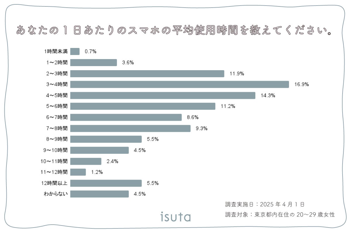最後に、デジタルネイティブといわれるZ世代女性のスマートフォン利用の実態についても調査したところ、1日あたりのスマホの平均使用時間としてもっとも多かったのが3〜4時間、次いで4〜5時間という結果に。都内在住の20代女性は、情報収集やコミュニケーションに必要なツールとして活用する一方で、スマホを使わない他の活動にも時間を割いていることがうかがえます。