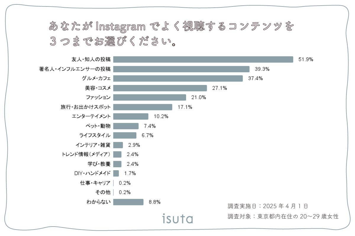 また、Instagramで視聴しているコンテンツについては「友人・知人の投稿」が「著名人・インフルエンサー」よりも多く51.9%となっており、20代女性にとってInstagramはコミュニケーションツールであり、身近な人との近況報告や日常の記録として活用していることがわかります。なお、メディア等のアカウントからトレンド情報を得ると答えた割合は2.4%で、Z世代女性にリーチするためには、一方的な情報発信よりも、双方向のコミュニケーションができたり、よりパーソナルな発信をしていたりするユーザー視点で身近な情報を発信するアカウントが好まれる傾向があるようです。