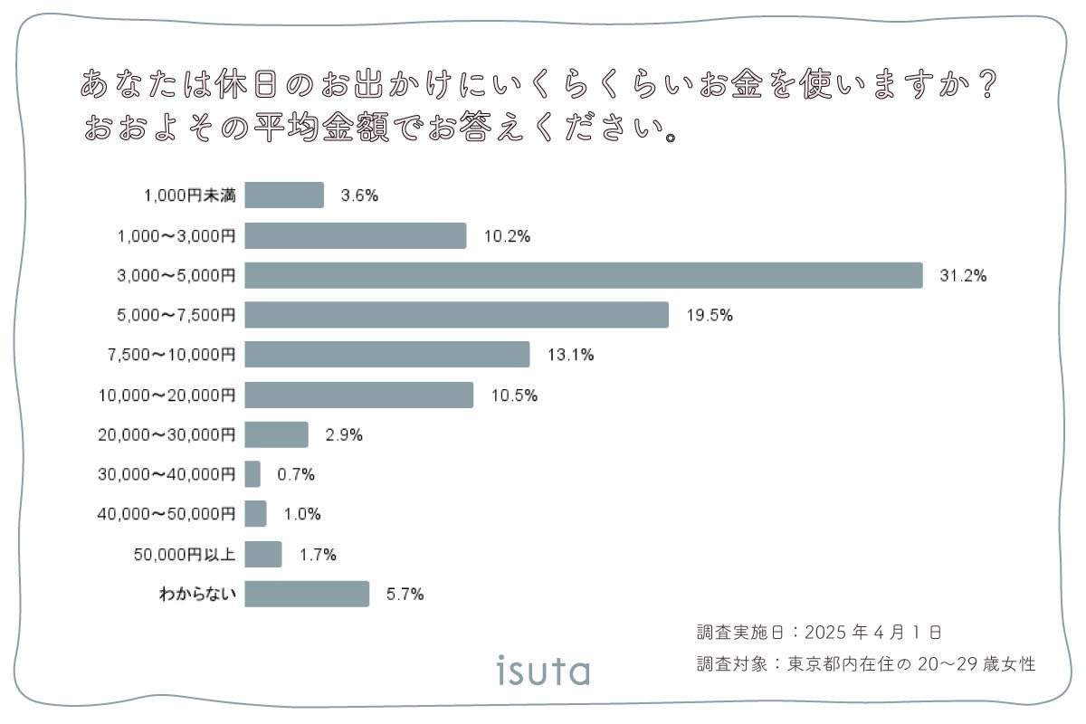 なお、休日のお出かけにかける平均費用としては、3000〜5000円が最も多く、次いで5000〜7500円、その次が7500〜1万円という回答でした。