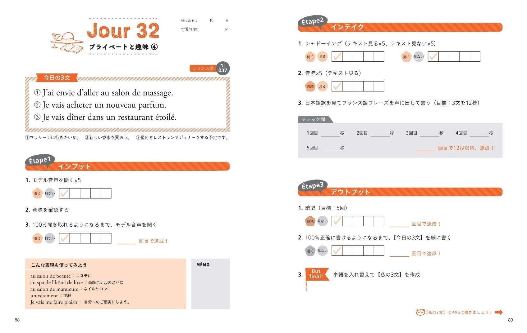 とにかく聞く「インプット」、声出しで定着させる「インテイク」、スラスラ声出し+書く「アウトプット」の3ステップで、使えるフレーズが定着します。