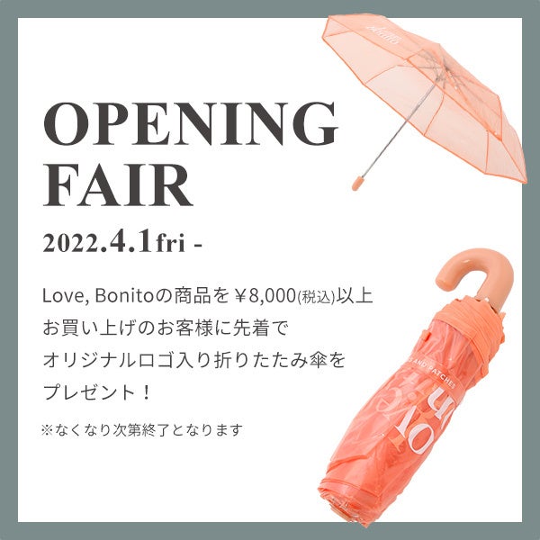 ドットエスティへのオープンを記念して、Love, Bonitoの商品を8,000円(税込)以上お買い上げのお客さまに先着で、ロゴ入り折りたたみ傘をプレゼント(数量限定、なくなり次第終了)
