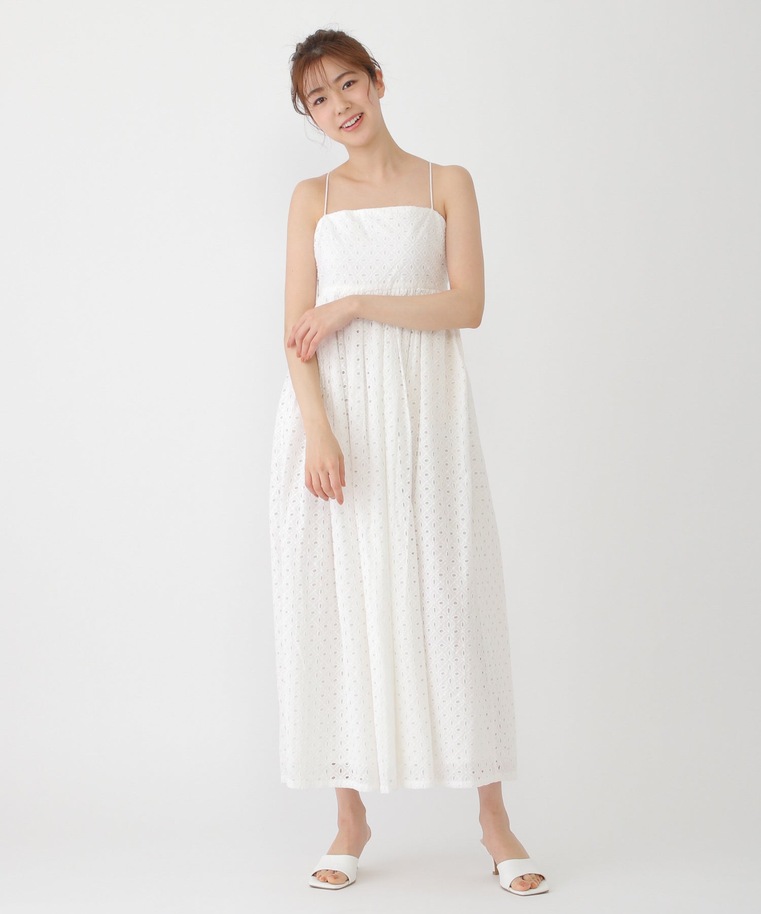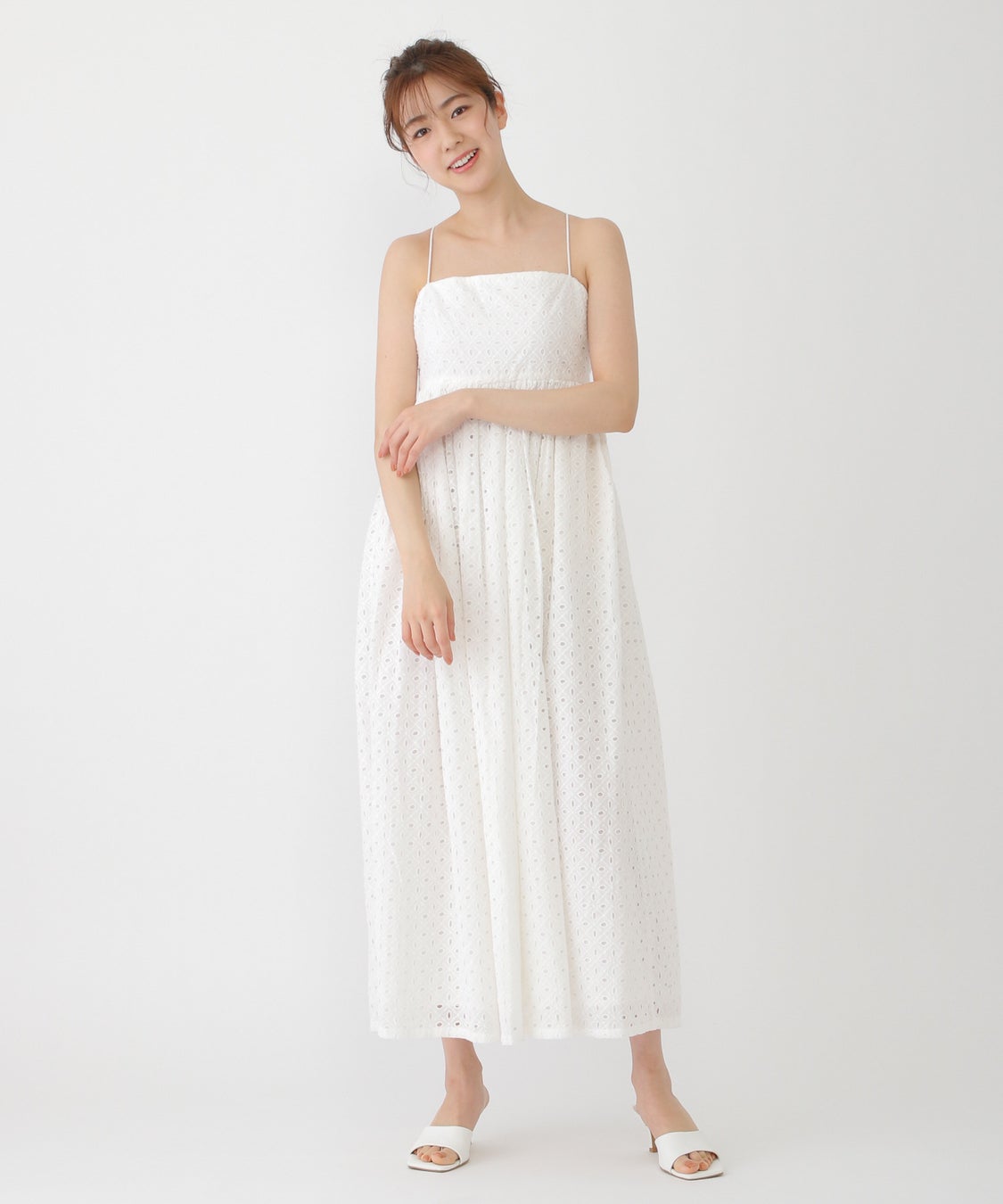 ブロドゥリで仕立てられたマキシ丈ワンピース。