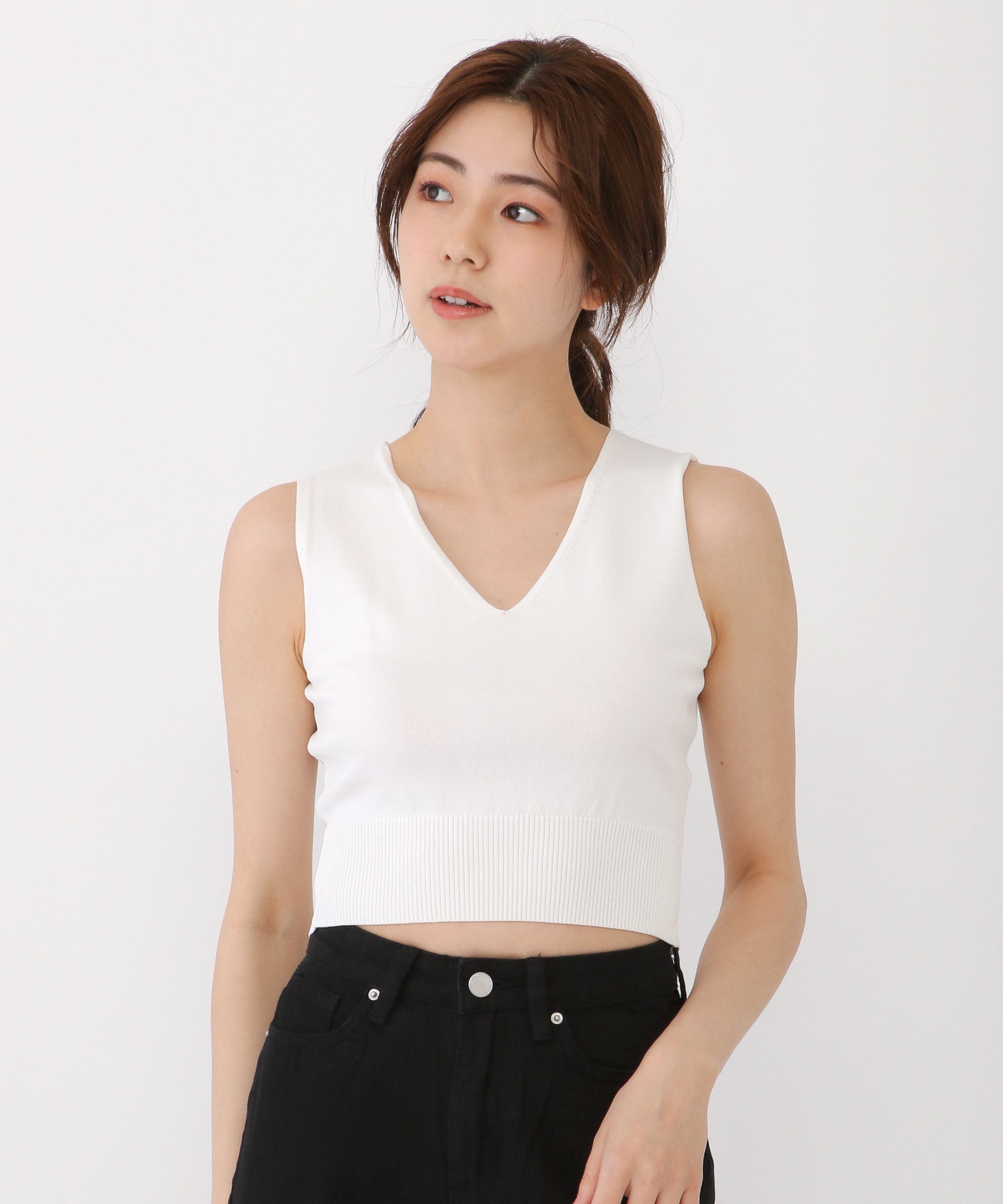 袖がないのですっきりとしたシルエットでエフォートレスな1枚。柔らかなリブデザインは程よいフィット感で着用でき、Vネックデザインはデコルテを綺麗に見せてくれる優れモノ。