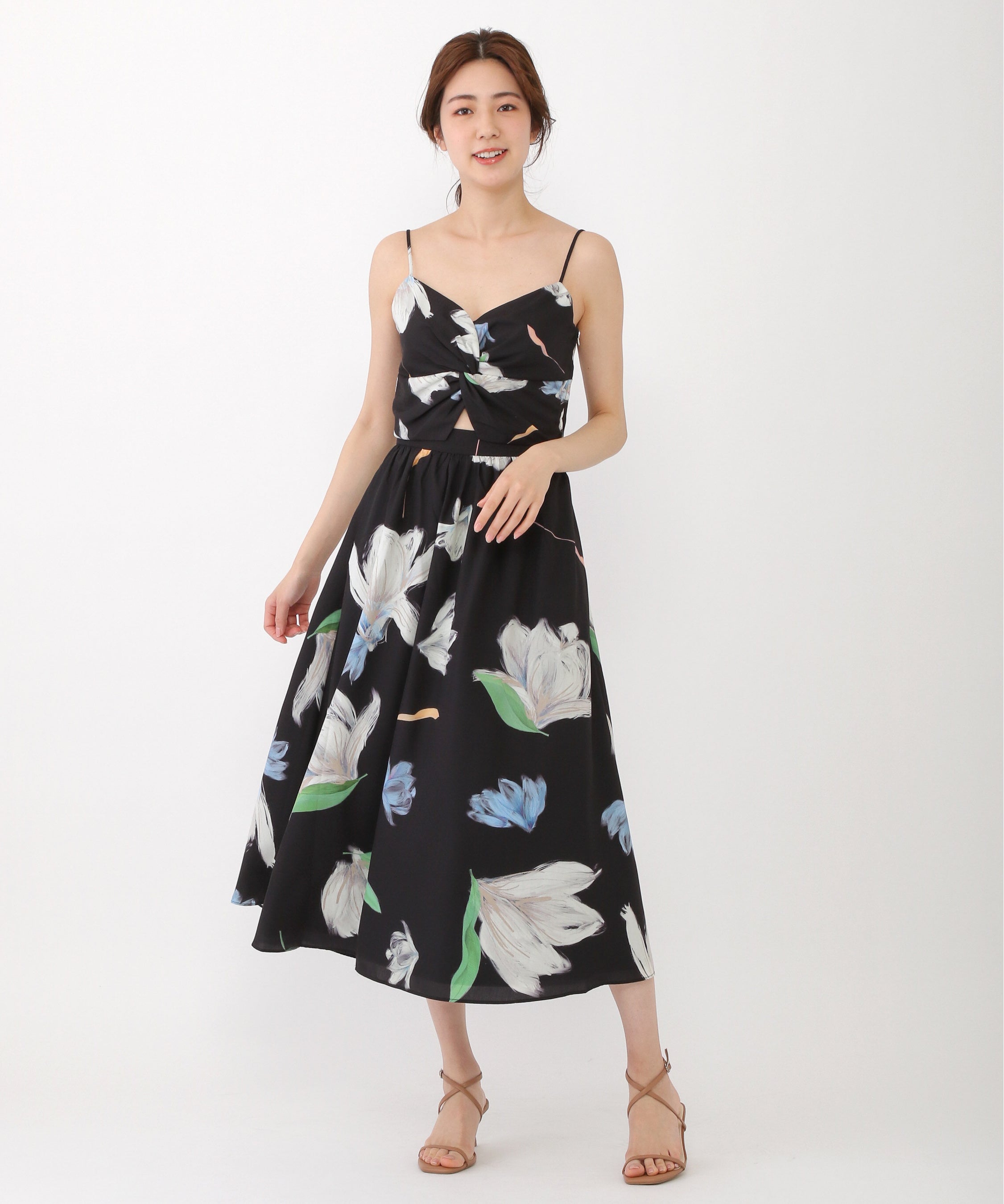 通気性の良い素材感で着心地も良く、サイドジップ仕様で着脱しやすいのもポイント。華奢なストラップでデコルテもキレイに見え、フィットアンドフレアが叶う1枚です。