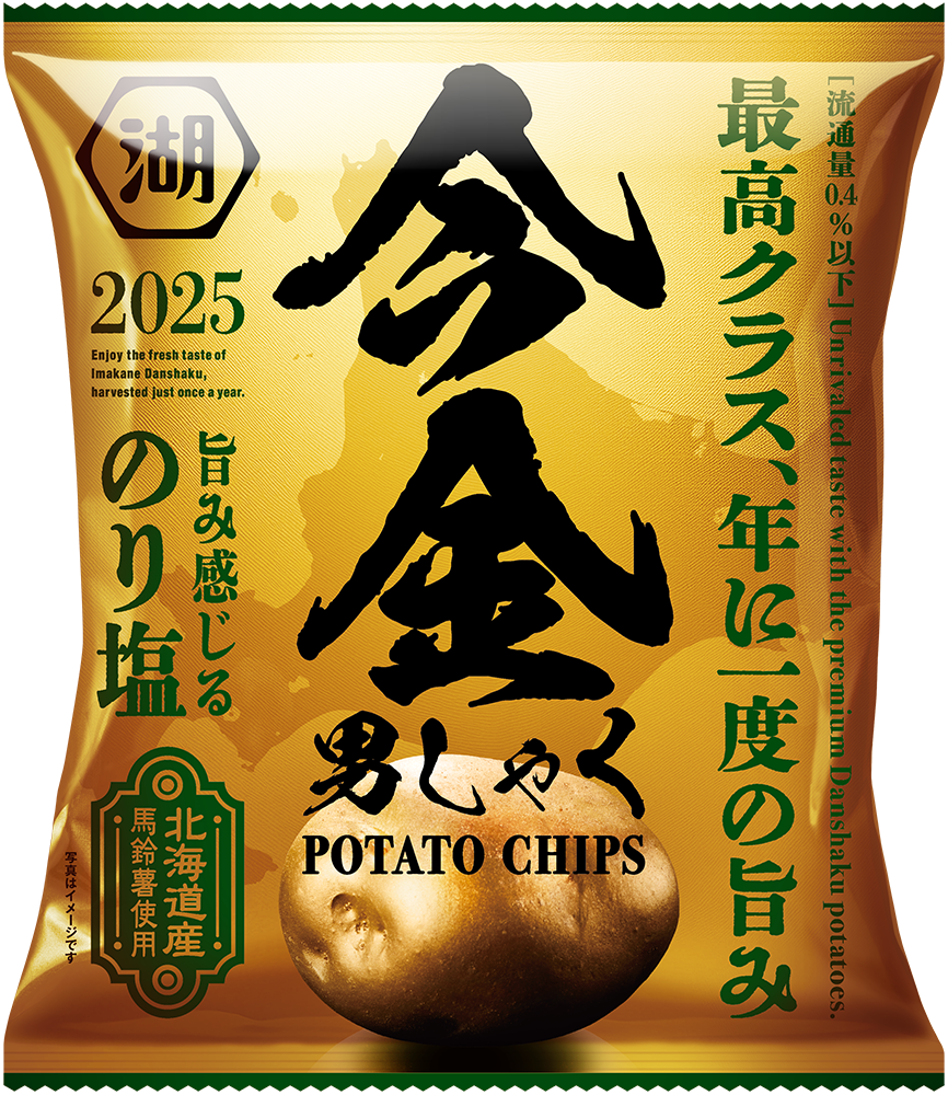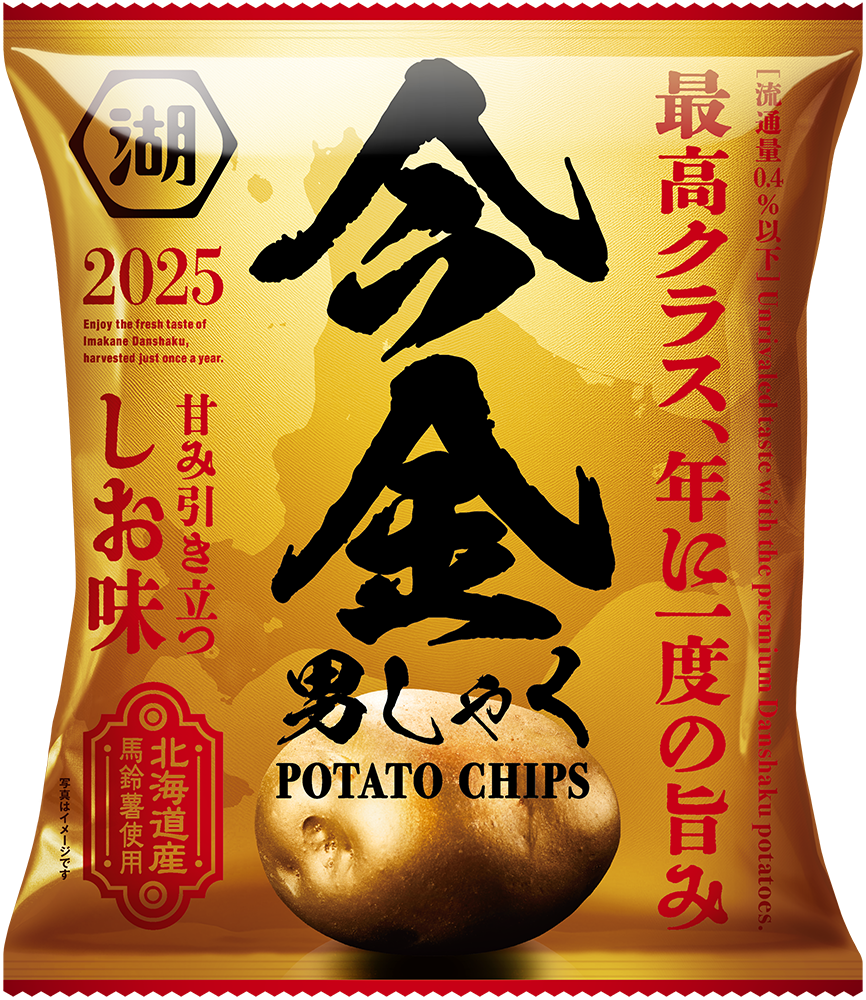 パッケージもリニューアルし、より堂々としたデザインへと生まれ変わった「今金男しゃくポテトチップス」。今金男しゃく100%のポテトチップスは、最高品質の“今金男しゃく”のおいしさが存分に味わえる、年に一度だけの特別なポテトチップスです。最高クラスの今金男しゃくと、老舗・湖池屋の技術とこだわりが生んだ逸品を、是非、ご賞味ください。