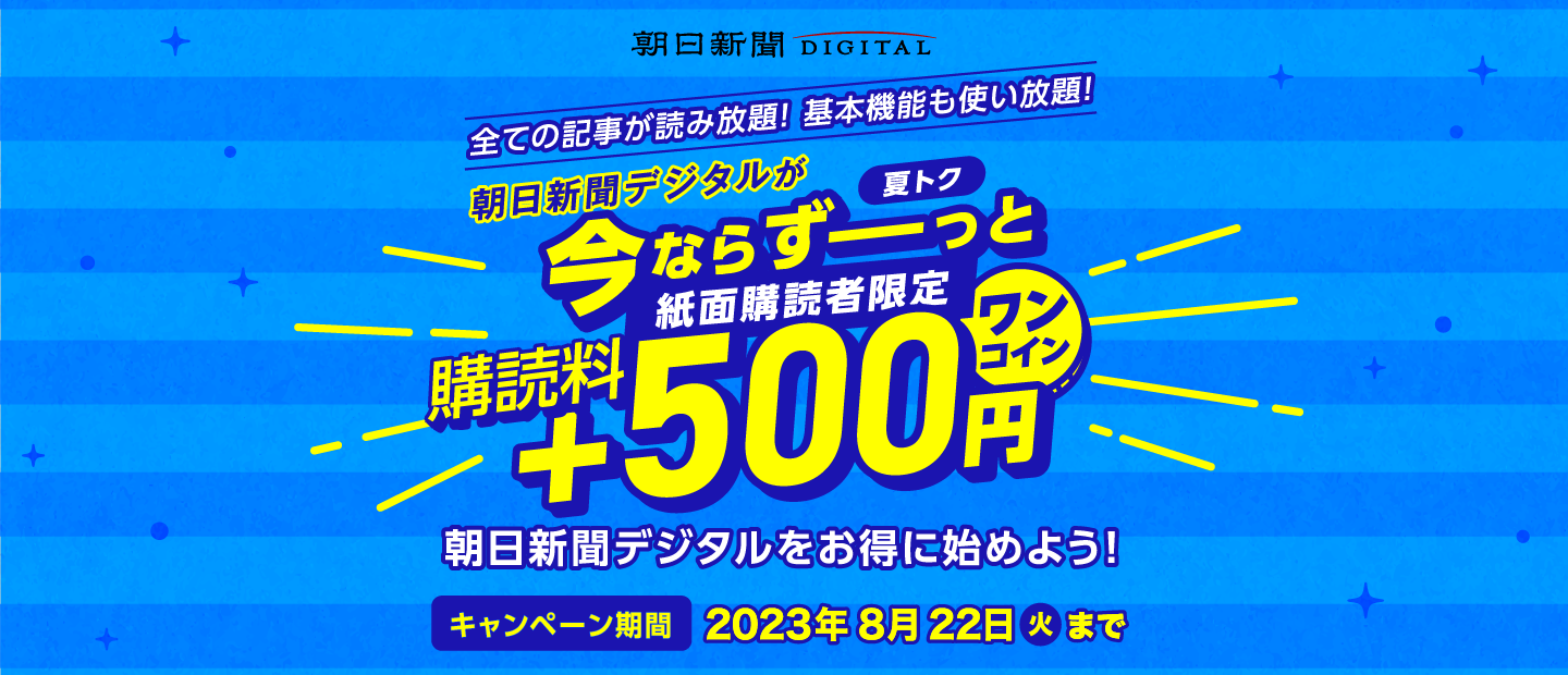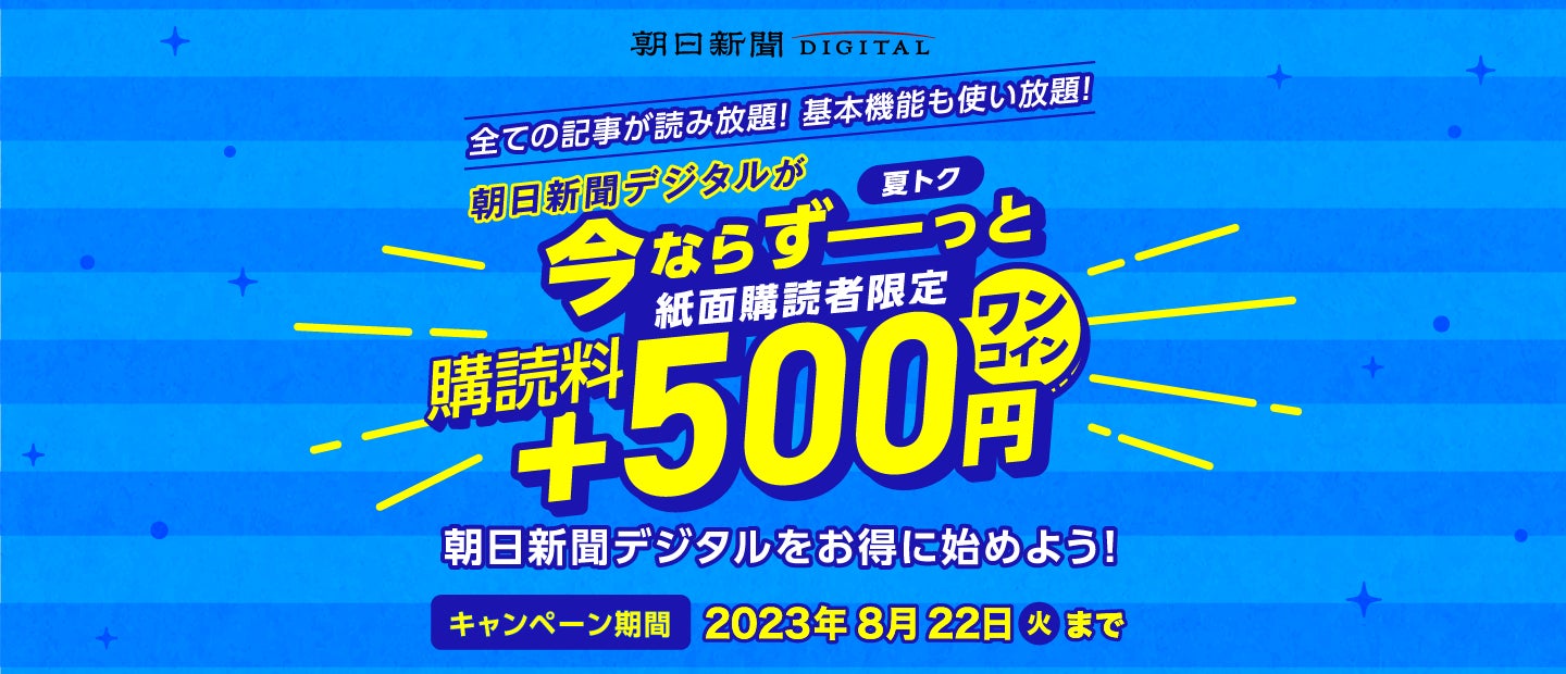 株式会社朝日新聞社(代表取締役社長:中村史郎)が運営するニュースサイト「朝日新聞デジタル」(https://www.asahi.com/)は、2023年7月27日(木)から8月22日(火)まで「夏トク」キャンペーンを実施します。