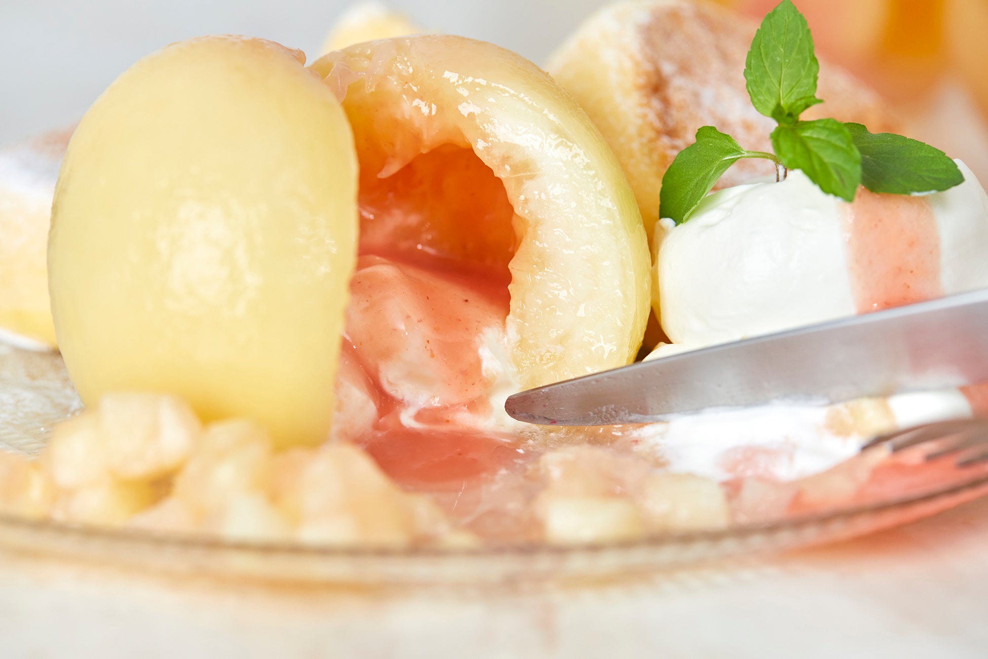 桃の中には、レモンの酸味をアクセントにしたピンク色の桃のソースと軽い口当たりのレアチーズクリームを忍ばせ、桃本来の自然な甘さを生かしました。