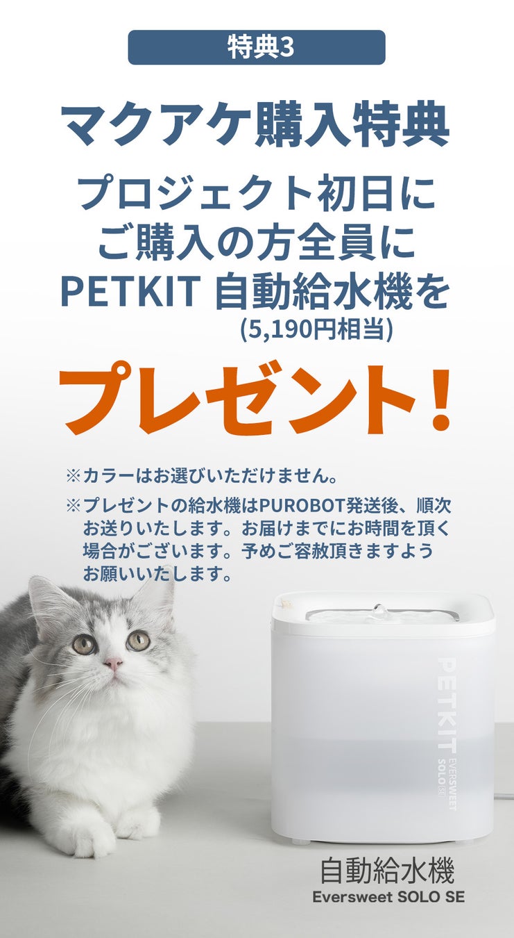 3、プロジェクト初日にご予約頂いた方全員にPETKITの自動給水機(¥5,190(税込)相当)をプレゼント。