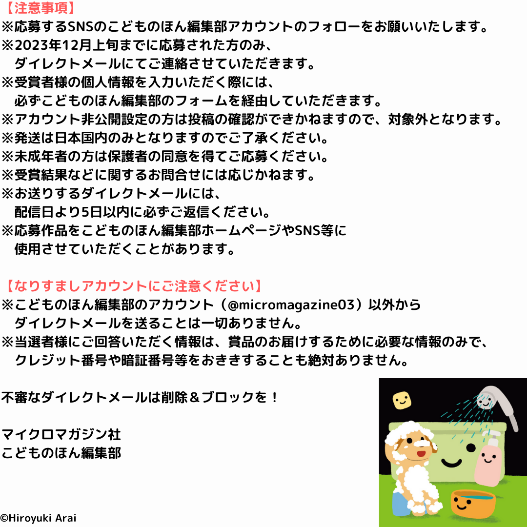 ※応募作品をこどものほん編集部ホームページやSNS等に使用させていただくことがあります。