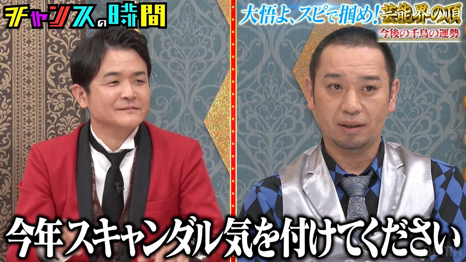 そして、多田さんは独自の伝手を辿って占い師に占ってもらったという千鳥の未来を発表。多田さんから告げられた「2人とも今年スキャンダルに気をつけてください」「特にノブさん気をつけてください」という占い結果に、大悟さんは「本当にそうかもしれない」「(週刊誌は)大悟なんて相手にしてないですから、危ないのはノブ」と納得。ノブさんは「俺はその辺は大丈夫」と否定しました。