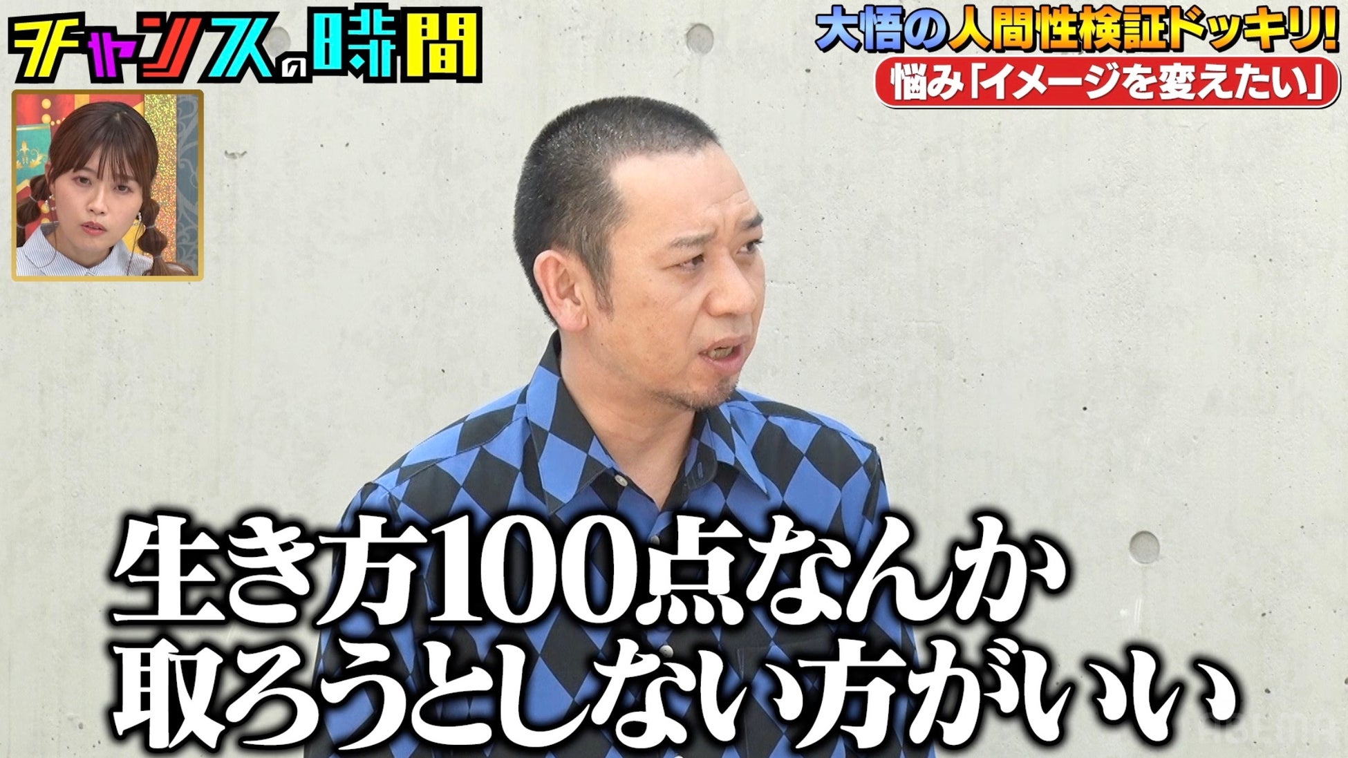 「イメージを変えたい反面、ちょっとでも汚い言葉を使うとイメージが一気に悪くなる」と苦悩を明かした宇内さんに、大悟さんは「宇内さんはわしとは違う生き方を子どもの頃からしてきたんでしょう」「よく言う優等生。優等生が悪いわけじゃないけど」とし、「テストで100点取ろうとするのはいいと思うんですけど、生き方で100点なんか取ろうとしない方がいい。60点がちょうどいいっすよ」「半分より上なら十分」と持論を展開。「客観的に見ていると、(大悟さんは)100点の生き方をされている」という宇内さんに、大悟さんは「100点取ろうと生きている人は、周りからは100点取れてないと思われる」「60点取ろうとしてる人間は周りから見れば『100点じゃん』っていう、ラクに楽しそうに生きてるな(と見える)」と続けました。ドッキリ検証後、宇内さんは「100点を取ろうとする生き方をしてきたので、100点取れなかったらっていう視点で減点方式になってしまう」「大悟さんが与えてくれた言葉は“60点くらいを狙って100点になる方がいい”。それぐらいの気持ちでいた方が余裕のある人だと見られるからこそ豊かな人生を送っているように見える」と、大悟さんの言葉をしみじみ振り返りました。放送後7日間、無料で見逃し視聴が可能です。ぜひ、ご覧ください。