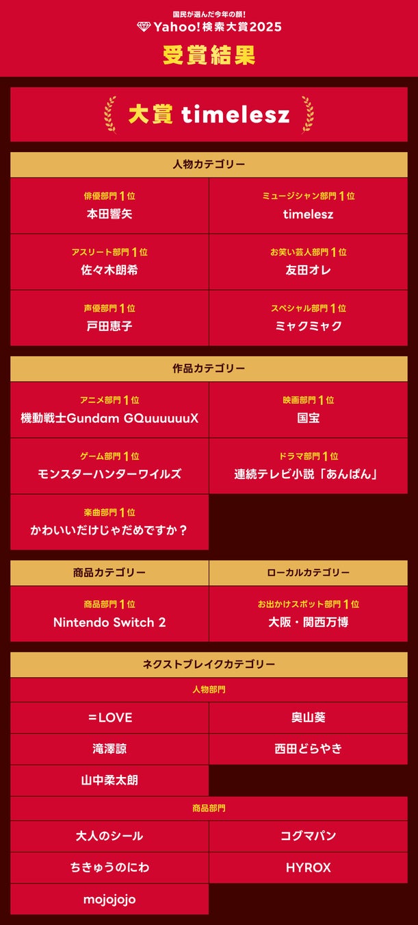 ■内容:「Yahoo!検索大賞2025」は、期間集計データをもとに、“今年の顔”として検索数が最も急上昇した人物に贈る「大賞」に加え、「人物カテゴリー(6部門)」(「俳優」「ミュージシャン」「アスリート」「お笑い芸人」「声優」「スペシャル」)、「作品カテゴリー(5部門)」(「アニメ」「映画」「ゲーム」「ドラマ」「楽曲」)、「商品カテゴリー(1部門)」(「商品」)、「ローカルカテゴリー(2部門)」(「お出かけスポット」「都道府県」)を発表しています。また、今後の活躍が期待できる人物、ヒットが予想される商品を「ネクストブレイクカテゴリー(2部門)」(「人物」「商品」)として発表します。