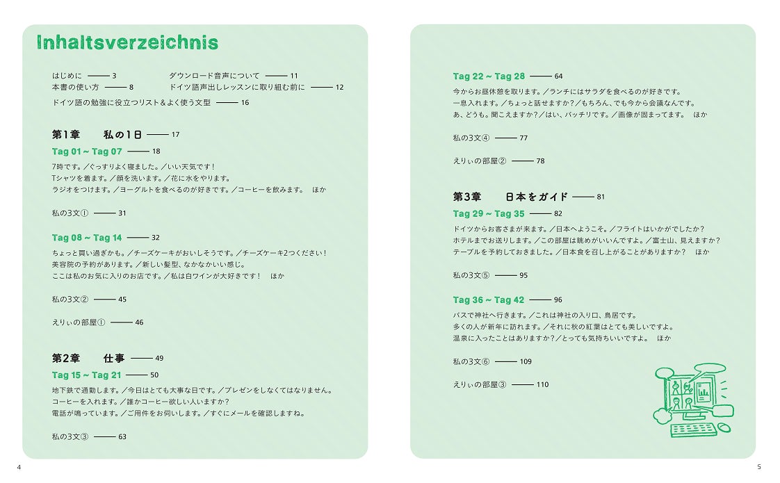 短く、しかも声に出して発音しやすく、自然なフレーズにこだわりました。また、汎用性の高いフレーズを多数収録しています。だから、覚えたらすぐ活用できます。また、1日の分量がたった3文なので、毎日、ドイツ語学習を楽しく続けられます。
