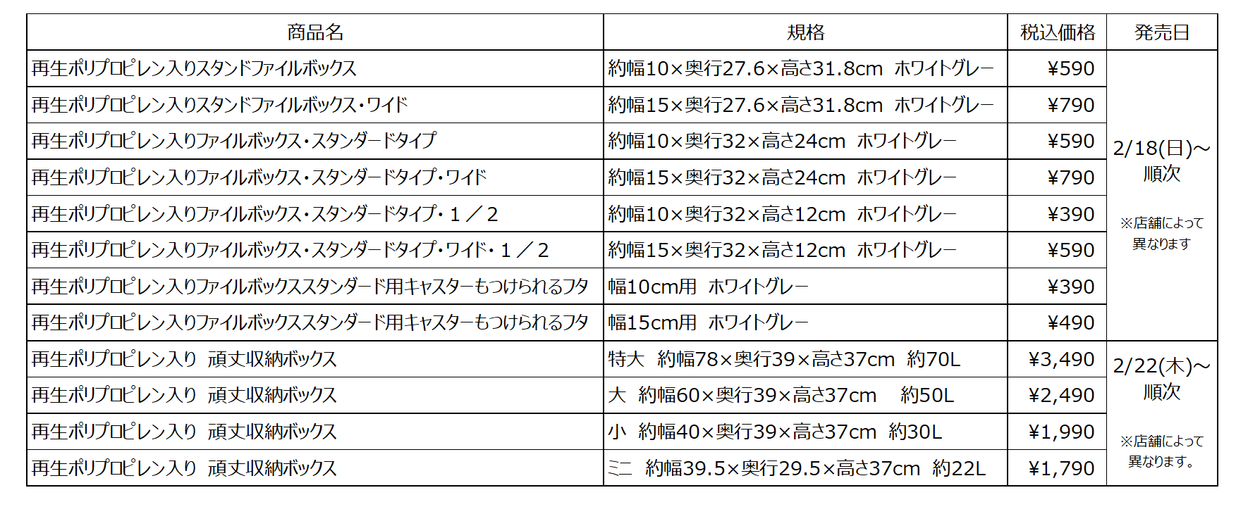 当社では、これまで再生ポリプロピレンを一部使用した商品として、2021年12月に「再生ポリプロピレン入り フタが選べるダストボックス」<再生材:50%使用>の発売をはじめ、2022年8月には「再生ポリプロピレン入り 頑丈収納ボックス」<再生材:75%使用>、2023年2月には「ポリプロピレンファイルボックス ダークグレー」<再生材:95%使用>を発売してきました。