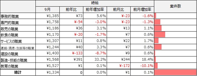事務的職業は1,385円(前年比73円増、前月比23円減)、専門的職業は1,758円(前年比54円減、前月比23円減)、飲食の職業は1,186円(前年比36円増、前月比13円増)、販売の職業は1,170円(前年比20円減、前月比7円増)、サービスの職業は1,307円(前年比11円増、前月比22円増)、運搬・清掃・包装等の職業は1,244円(前年比40円増、前月比7円増)、建設の職業は1,400円(前年比133円減、前月比9円増)、製造・技能の職業は1,568円(前年比391円増、前月比244円増)、教育の職業は1,527円(前年比1円増、前月比172円減)となりました。