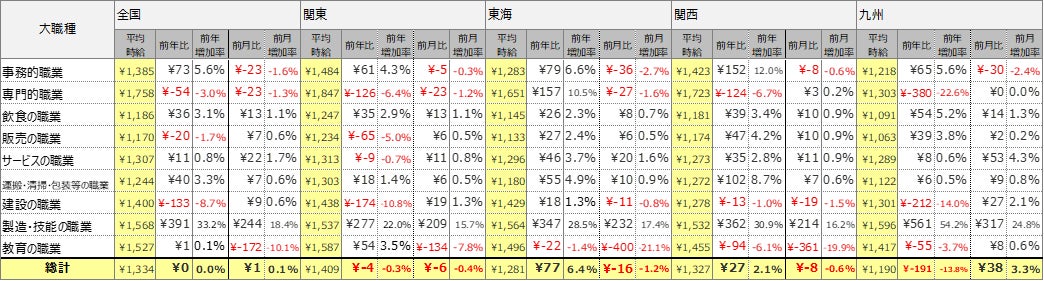 関東エリアの平均時給は1,409円(前年比4円減、前月比6円減)、東海エリアの平均時給は1,281円(前年比77円増、前月比16円減)、関西エリアの平均時給は1,327円(前年比27円増、前月比8円減)、九州エリアの平均時給は1,190円(前年比191円減、前月比38円増)となりました。