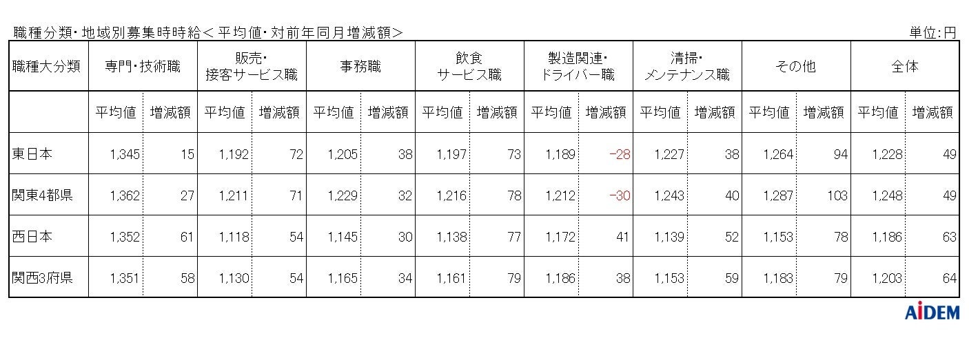 職種大分類別の平均時給は、「専門・技術職」1,345円(前年同月比15円増)、「清掃・メンテナンス職」1,227円(同38円増)、「事務職」1,205円(同38円増)、「飲食サービス職」1,197円(同73円増)、「販売・接客サービス職」1,192円(同72円増)、「製造関連・ドライバー職」1,189円(同28円減)の順で、前年同月比でプラスが5職種、マイナスが1職種となった。