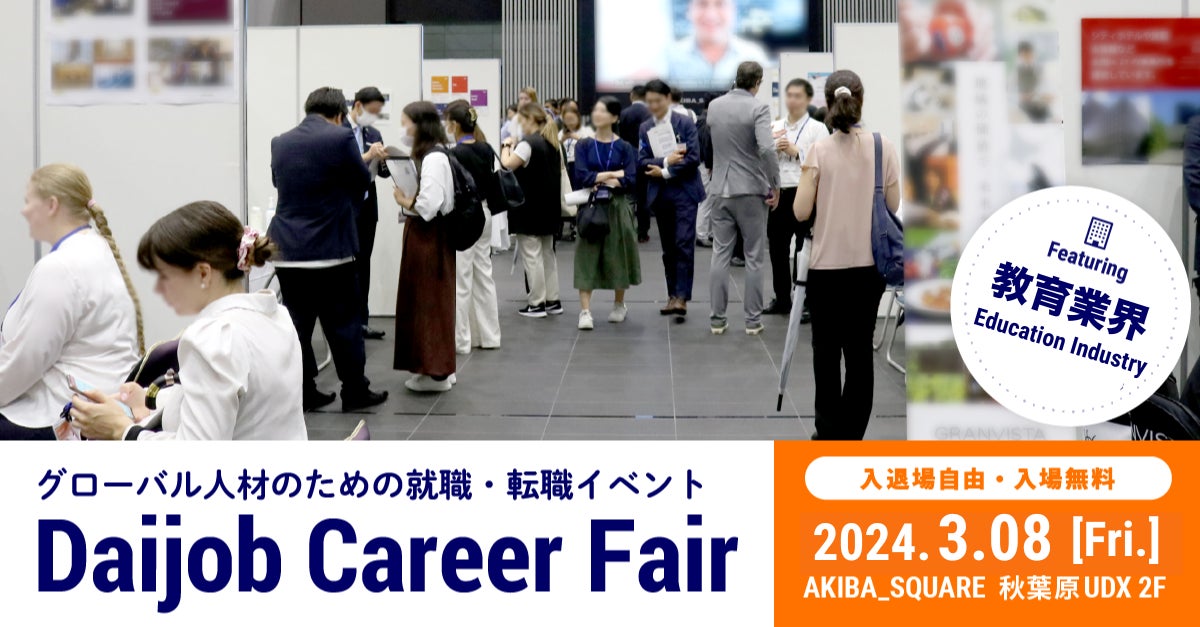 ■英語などの語学力を活かして働きたいグローバル人材のための転職イベント「第51回Daijob Career Fair」を2024年3月8日(金)、AKIBA_SQUARE(東京都:秋葉原)で開催 ■多様な業界の企業が出展し、今回は2~5月に最も転職市場が活性化する「教育業界」のエリアを特設 ■日本人向け、外国籍人材向け、それぞれを対象にした転職に役立つセミナーも開催 |