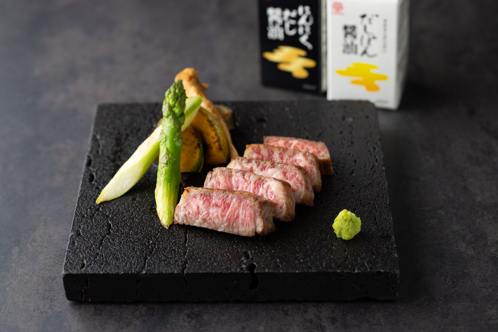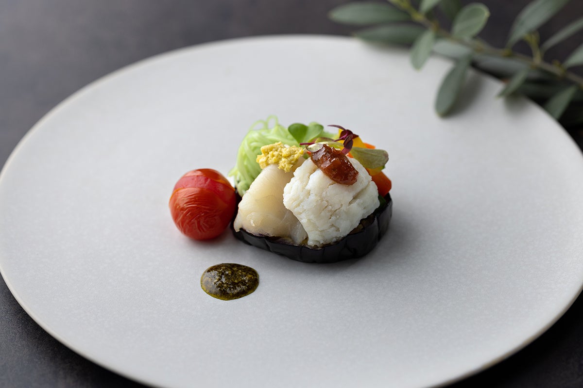 今回は、3年に1度開催される現代アートの祭典「瀬戸内国際芸術祭2025」の会場にもなっている香川県をピックアップ。シェフが香川県を訪れた際に虜になった食材を、香川県名産のオリーブをキーワードにセレクトし、うどんは一切使わず表現しました。冷前菜の鱧には梅肉、香川海域で採れる讃岐でんぶくにはタプナードをトッピング。だしで炊いた茄子の上に、オリーブそうめんとともに盛り付け、ラタトゥイユをモチーフにした彩り豊かな野菜を添えてご提供いたします。温前菜には、ソテーしたオリーブ豚をレタスやレモンとともに、だし仕立ての小鍋としてご用意。添えられたレモン氷と一緒にお召し上がりいただくことで、ひんやりとした食感とレモンの爽やかな風味が加わり、温と冷が共存する一品です。魚料理では、マナガツオのポワレに小海老のかき揚げをのせ、和風ベースのソースをかけてご提供。“うどん”を使っていないのに、どこか面影を感じさせる、シェフの遊び心溢れる一皿です。メインディッシュには、オリーブオイル採油後の乾燥果実を入れた飼料で育てられた「オリーブ牛」を、オリーブ塩や、香川県の老舗・鎌田醤油の「にんにくだし醤油」「だしぽん醤油」とともにお楽しみいただきます。その他にも、香川県のワインや地酒、ビールなども取り揃えておりますので、料理とのマリアージュをご堪能ください。
