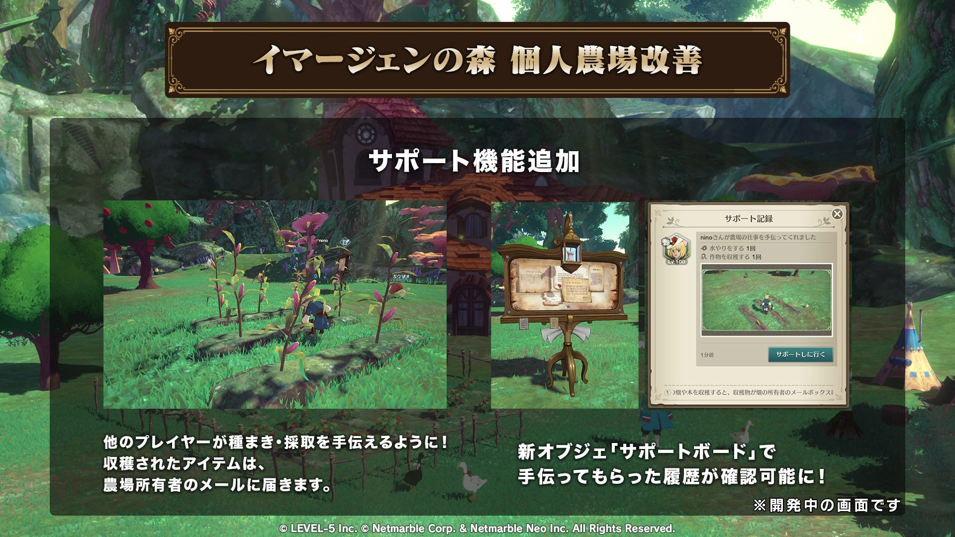 イマージェンの森の「個人農場」に、他のプレイヤーが種まきや採取を手伝うことができるサポート機能の追加や、ハウジングオブジェの設置をしやすくするためのUIの改善に加え、水やりを行った作物にエフェクトを追加し判別しやすくするなど、より快適に農場ライフを楽しんでいただけるようにアップデートを行いました。
